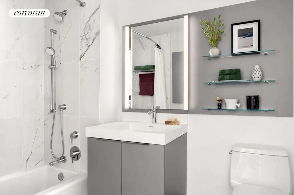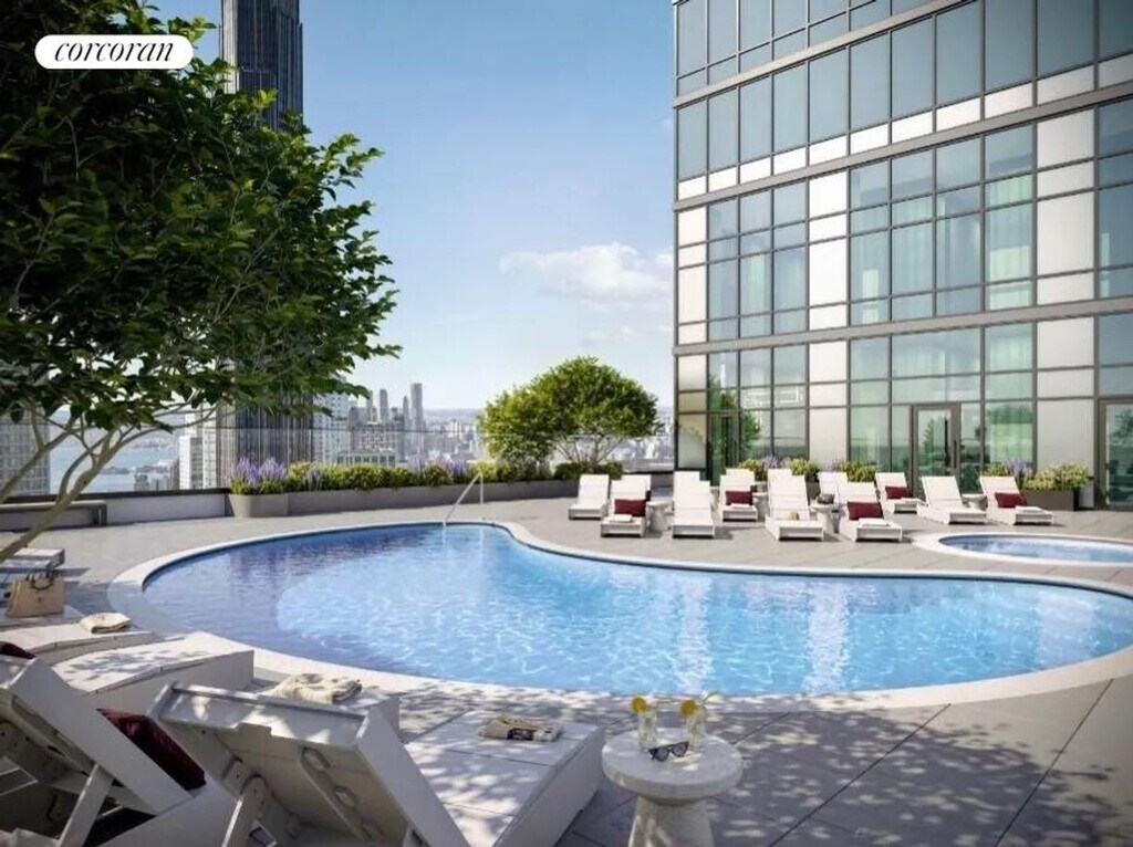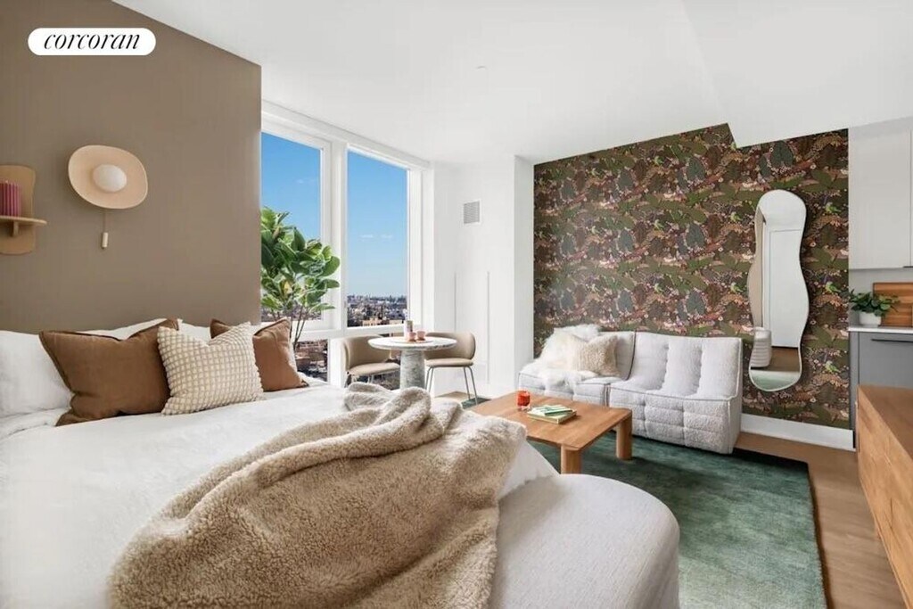 Introducing residence 2403 at 180 Ashland Place, a newly available studio in the heart of Fort Greene, Brooklyn. This bright and spacious home offers a sweeping open layout, complemented by multiple closets and stunning west-facing city views. The modern oak wood flooring adds a touch of elegance, while the Bertazzoni stainless steel appliances and quartz countertops and backsplash elevate the kitchen's functionality and style. The convenience of an in-home washer and dryer, along with USB/USBC outlets and solar shades, enhances the living experience.The spa-like bathroom is a sanctuary, featuring porcelain tile flooring, light-up vanity mirrors, Grohe fixtures, a medicine cabinet, and a quartz vanity with custom shelving. Located in The Everly, residents enjoy access to two floors of exclusive amenities. The 2nd Floor Clubhouse includes a state-of-the-art fitness center, Flow Studio, Ski Simulator Lodge, The Range Multisport Simulator, The Workshop, Kid's Nook, Content Studio, Fireside Lounge, and a Game Den with billiards, ping-pong, and shuffleboard. Outdoor enthusiasts will appreciate the Great Lawn with a movie screen, terrace with BBQ grills, and a pet run/play area.The 50th Floor Sky Lounge offers an outdoor pool deck with a hot tub, a Serenity Suite with a steam room, The Reserve wine and party room, a Workspace Garden, and a Game Loft with bocce and foosball. The Overlook Lounge provides breathtaking views of Manhattan and Brooklyn.Positioned in vibrant Fort Greene, The Everly places you moments away from Brooklyn's finest attractions and a short subway ride from Manhattan, with convenient access to Fulton St, DeKalb Ave, Nevins St, and Lafayette St stations. Experience the perfect blend of luxury and location at residence 2403 in The Everly. This is a lease reassignment until August 31, 2026 with the option to renew 12-month lease. Fee Disclosure: $20 application fee, first month's rent & one-month security deposit due at lease signing. Amenities: $150/month & Pets: $40/month.