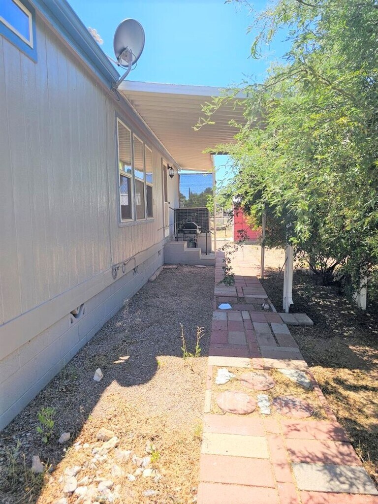 2 bedroom and a den or 3 bedroom manufactured home sits on a corner lot and has nice trees and shade. Spacious eat in kitchen and open floor plan to the living room (fireplace may not be used but provides a great focal point). Fenced yard and 1 or 2 pets considered with a deposit. Easy access to I-10 for short commute to Tucson, Sierra Vista or Benson.