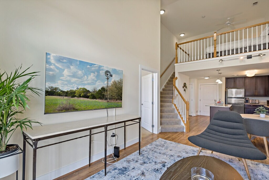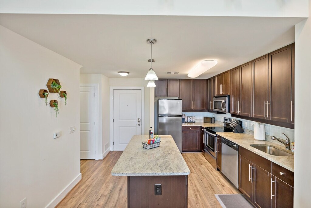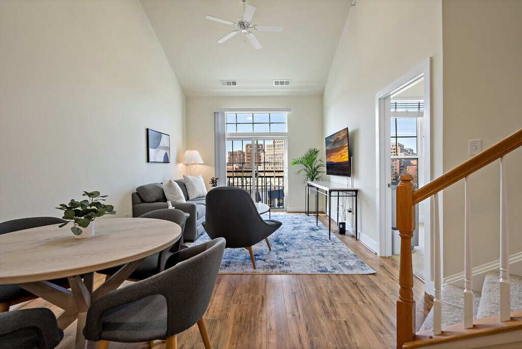 Feel at home in this stylish and unique loft, where well-located truly means steps from the action. This space is all about personality and flair. It features two queen beds, each furnished with a plush queen-size bed, cozy bedding, and ample storage space. The full bathroom has a shower/tub combo and fresh towels. The fully equipped kitchen includes stainless steel appliances, cookware, dishware, and essentials like a coffee maker and toaster. There is also a dedicated dining area with a table and chairs, a stylish and comfortable seating area with a smart TV, high-speed Wi-Fi, and an in-unit washer and dryer. Building amenities include a pool, gym, and lounge with a pool table, shared work areas, and a mail room and trash rooms. One of the bedrooms is in a loft, an open space without doors, up the stairs. Paid garage parking is available in the building’s garage for an additional fee, and metered street parking is available nearby. Pets are welcome for an additional daily or monthly fee. Conveniently located near shops, restaurants, and public transportation, making it easy to explore the city. A deposit is required for extra keys. [SI]