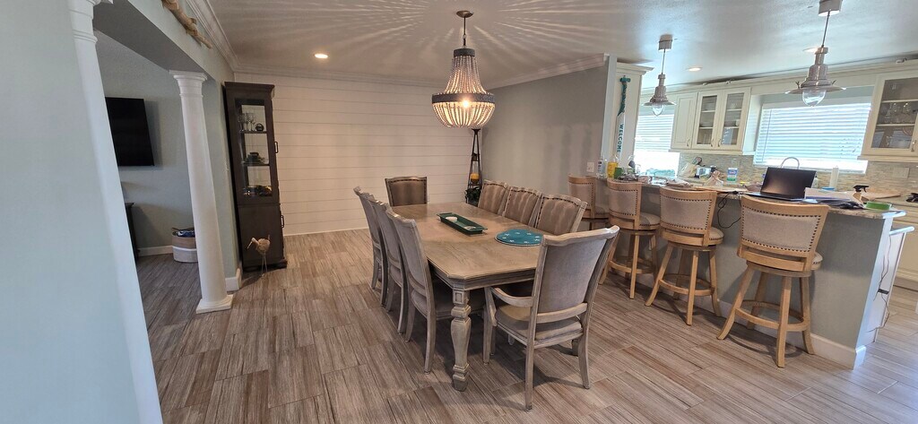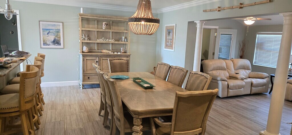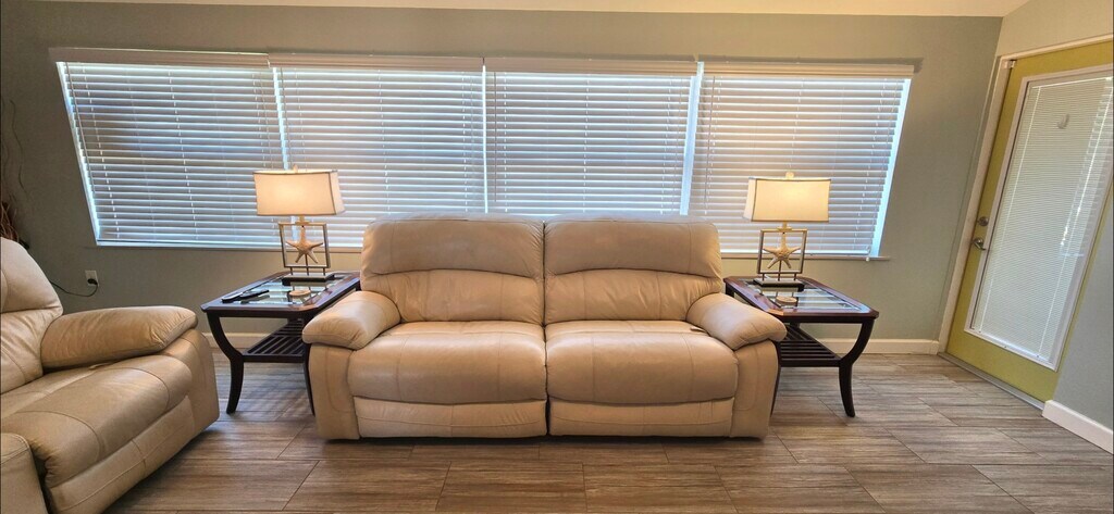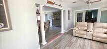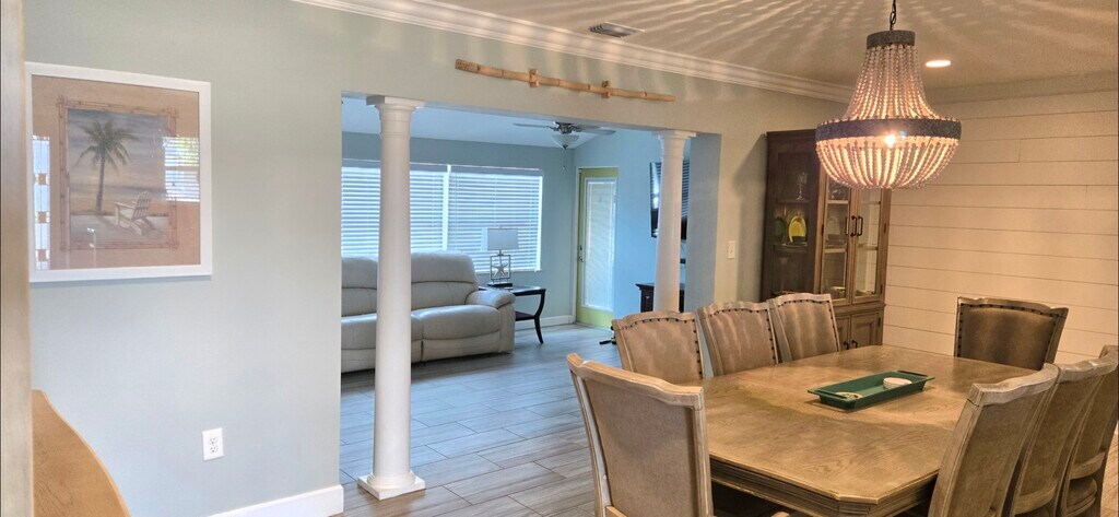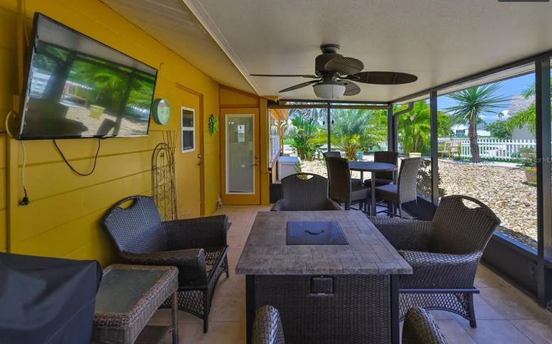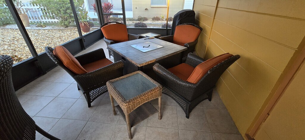 Welcome to your home away from home! The River House on El Rio Drive in Sun City Center is a beautifully updated single-family home. It is FULLY FURNISHED with two-bedrooms, two-bathrooms, and two-car garage located on a 9,300 sq ft large corner lot. Utilities included. The River House has modern kitchen features including granite countertops, stainless steel appliances, a built-in oven and microwave, soft-close cabinets and drawers, deep double sinks, and a tile backsplash. The open floor plan includes ceramic wood-like tile throughout the entire home. The kitchen and dining area are accented with pendant lights, chandelier, and crown molding. There is a large kitchen bar area with granite counter. Enjoy the outstanding mature landscaping with a variety of beautiful palm trees, silver yucca trees and flowering shrubs. The primary bathroom has been beautifully updated with tile, quartz countertops, and a walk-in shower. The primary bedroom also includes a walk-in closet, ceiling fan and crown molding. TVs in each bedroom, living room and in the screened in patio. Large utility room has a new dryer (2025) and Maytag washer. Utility room is heated and cooled and includes a sink, shelving and large space for additional storage. Enjoy the Florida spring weather watching TV in the large, screened-in back patio, complete with a ceiling fan, roller shades, grill and fire pit. Located in the top-rated 55+ Sun City Center golf cart community. The River House is located close to all Sun City Center community amenities as well as shopping, medical facilities and I-75. Convenient access to Tampa International Airport as well as the opportunity to see several professional sports teams and the beaches in Sarasota and more! 2 badges included to enjoy Sun City Center amenities (pools, fitness room, pickleball courts, etc.). No smoking or pets. Available 1 March 2026 for a period of 3 months.