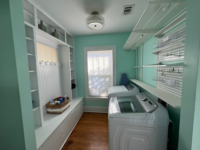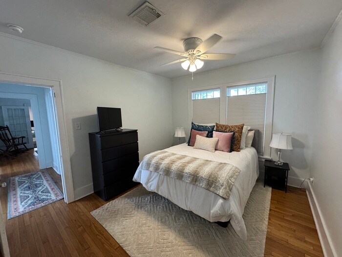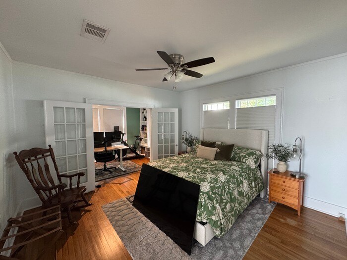 Charming Heights Bungalow. Two Bedrooms + Office and Two Baths. Light and bright with beautiful windows, hardwood floors, and French doors. Updated primary bath with separate shower and two closets. Laundry room with lots of storage. Large two-car garage with alleyway access and permanent stairway to second floor storage. Traditional home with lots of fun updates. Brick construction on corner of North Harrison and Cantrell Road. Really cool home! Contact us to schedule a showing.