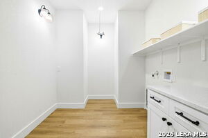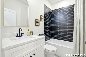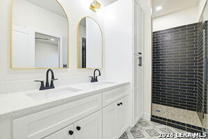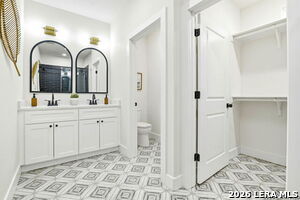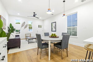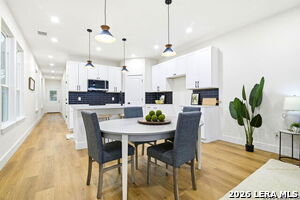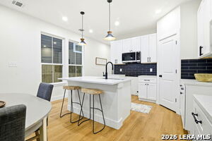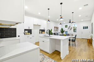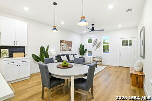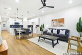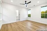 Beautiful newly built home located on a corner lot in the Harlandale neighborhood on the Southside, near downtown San Antonio! This modern residence features an open floor plan filled with natural light, perfect for comfortable living and entertaining. The kitchen boasts a large island, pantry, custom cabinets, elegant pendant lights, and recessed pin lighting. The third bedroom is conveniently located on the main floor, ideal for guests or a home office. Upstairs, the primary bedroom offers a ceiling fan, spacious walk-in closet, and a private en-suite bathroom with a shower and double vanity. Ceiling fans are installed in every room for year-round comfort. Enjoy outdoor gatherings in the fenced backyard that provides added privacy. Conveniently located near I-35, South Park Mall, H-E-B, Home Depot, and plenty of retail, dining, and entertainment options.