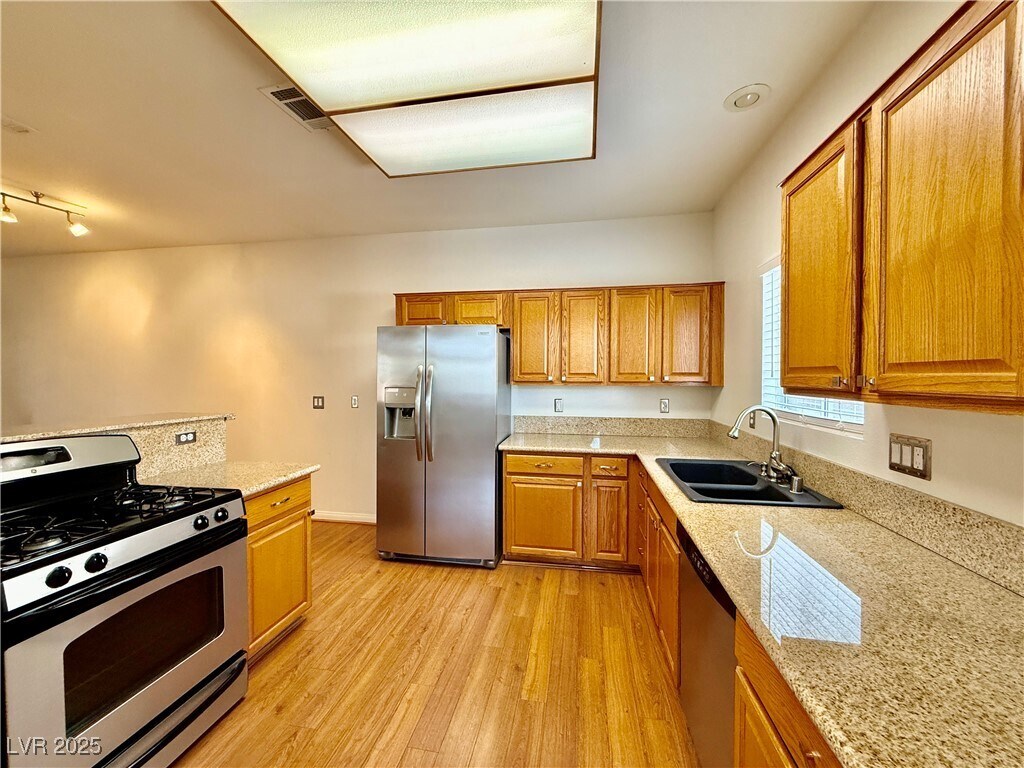 WOW—wait until you see this one! Beautiful 3-bedroom, 3-bath home located in the desirable gated Grand Legacy community, just ½ mile from the 215. This well-designed floor plan features a downstairs bedroom with a walk-in shower, ideal for guests or multigenerational living. Enjoy fresh interior paint, high-end designer carpet, and a home that is spotless, stylish, and truly move-in ready. The primary suite offers French doors leading to a private balcony, perfect for morning coffee or evening relaxation. The kitchen is equipped with stainless steel appliances, and the adorable, low-maintenance backyard provides a cozy outdoor retreat. Every inch of this home is clean, charming, and thoughtfully cared for. No pets, please. This is a definite must-see rental in a popular location!