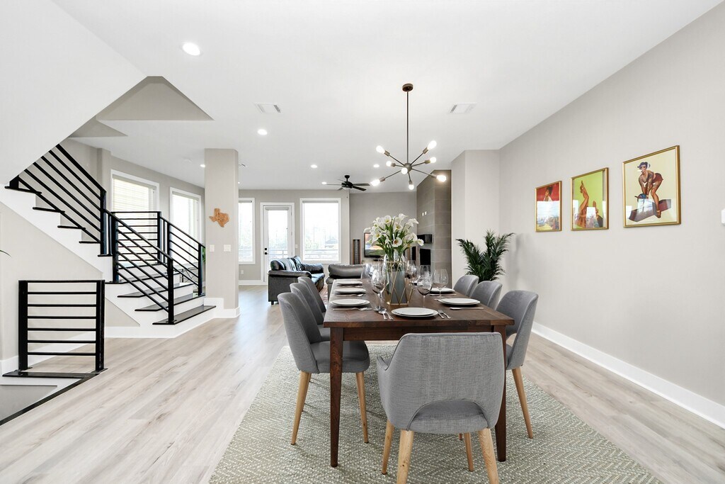 FOR LEASE- SHORT/LONG TERM! Modern luxury in the heart of Rice/Museum District! Nestled in a gated 3-home community with shared green space,this 3-story former model home offers the ultimate lock-and-leave lifestyle—blending freedom,flexibility & luxury living. Elegantly designed with Alabama QUARTZ countertops,a waterfall-edge island,soft-close white cabinetry,porcelain tile in the bathrooms,custom black-stained red oak stairs w/ iron railings,and designer lighting throughout. The oversized primary suite features a spa-like bath with a stand-alone tub,walk-in shower,and large closet. Enjoy entertaining in the open-concept living & dining area anchored by an elegant fireplace on the second floor. Two secondary bedrooms include private en-suite baths,providing comfort and privacy for guests/family. Minutes from world-class museums,the Med Center,Hermann Park,& top dining spots—perfect for those who crave a vibrant,city-connected lifestyle. Inquire about FURNISHED OPTION. MLS# 76477500