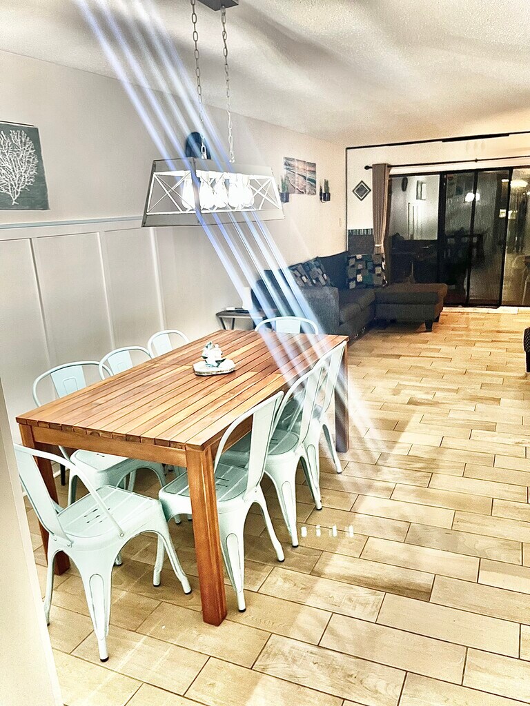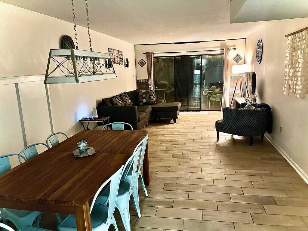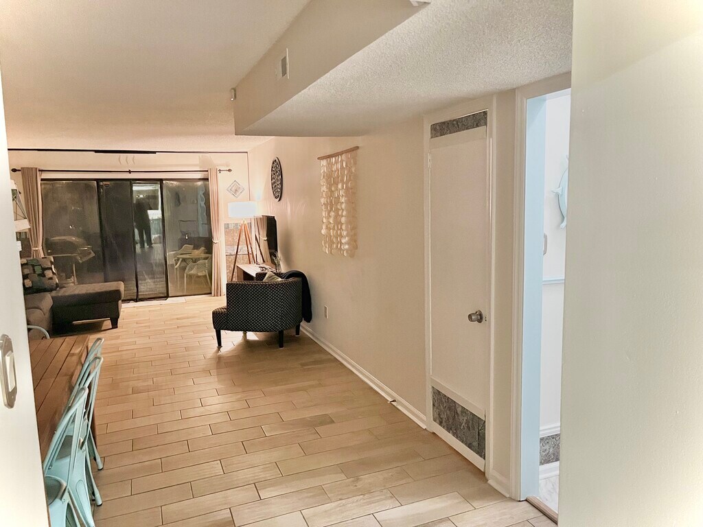 This condo is in prime condition since fully renovated with high-end furnishing- 1323 sq ft, 2 story, 2-bedroom & 2-bathroom condo is prime condition all in a superior location. The two-story ceiling entryway flows to open-concept dining & living space. The flow continues to a private patio on a small lake with wildlife- fishing is permitted by Deerfield's residents. Coastal living cannot be found any better being less than .75 miles from the beach, 8ft deep swimming pool & clubhouse are within eyesight. The two-story unit is zoned as "condo," but features only private entryways (no shared entryway or exits) with the potential of having loud neighboring residents- no one lives above or below. The peaceful aura is prevalent with the private patio, private balcony, & small lake. Location is beyond impressive with quick access to a wide variety of entertainment venues, dining & nearby shopping centers on Kings Hwy & 544. Deerfield neighborhood atmosphere is soothing & lacks noise pollution. The established neighborhood is peaceful since nearly half the condos/homes are occupied partial months (since many are 2nd homes by owners). This space is fully furnished with all previous fixtures, appliances, flooring & furniture were replaced with new high-end items around 2023-2024- a full interior renovation surrounded by tall trees on the water and being near to the ocean is a rare gem. Deerfield's has desirable proximity to Myrtle Beach's recreational areas. Surfside Beach community is unique with a cozy atmosphere being free of large resorts, over-crowded pathways/spaces & dense population. Deerfield is a secure gated community. Additionally, this space has advanced security features with tenant-controlled outdoor cameras and sensors to detect abnormal activity. This unit can be easiest explained by room. Kitchen: The kitchen was renovated and contains ice mist toned cabinets with soft-close. The quartz countertops provide substantial space to prepare meals. The stone backsplash compliments the quartz countertops throughout. All of the matching appliances were replaced 2023-2024 & done so with high-end features with specialty features. The matching smudge free stainless appliances include wifi/bluetooth refrigerator, range, microwave & dishwasher. The kitchen is fully furnished with serving placements & glassware to serve 16 guests. Bar glassware is included. Kitchen includes small kitchen appliances, cutlery & utensils necessary for meal preparation. Tucked away in the kitchen are new stacked washer/dryer unit behind the gliding barn door. All appliances have instructions to reference. The hue of the cabinets & trim replicate a natural sky with the Grand Strand sandy tone coloring of the flooring. Lower-level bathroom is directly off of kitchen and oversized open-concept dining/living area. Lower renovated bathroom contains new shower insert, toilet, vanity and sink top lit with new light fixtures as well. Flooring is new & same as the first floor. Main room: The largest open-concept room (dining/living room space) of the house flows from the generous sized two-floor entryway & kitchen. Space surrounding the suggested dining area is accentuated by dining table with 8 chairs. Walls in dining table location is fresh Wayne's coating. Room flows with the oversized living space. It easily fits an L-shaped sectional, a television stand holding a 55" smart TV, coffee table, 2 end tables & large circular shaped accent chair. Room concludes with an accent wall with near triple floor-to-ceiling windows- within 3 window panes is a sliding door on the back of the unit to private patio with privacy fencing to neighbors. Patio contains a gas grill if desired to be used. The second floor contains both bedrooms & newly carpeted second floor & stairway (besides tiled second floor bathroom that matches the lower level tile.) The smaller of two bedrooms fully remodeled: features a (adjustable) wall-mounted 42" smart TV. A desk with two drawers has a set up for a computer spare monitor, Bluetooth, keyboard, mouse, cords, etc. Room contains new bed and bedding (comforter, 4 pillows, multiple sheet sets). Two end tables match desk and have matching lamps. New ceiling fan fixture was installed. Room contains large windows nearly floor to ceiling, a built-in sliding door. Closet is quad doored and contains updated wardrobe storage system. The upstairs hallway is open to the entryway and connects linen closet, second larger bathroom, large walk-in closet, off of hallway and second oversized bedroom. The hallway walk-in closet: Has recently installed ample storage configurations & newly carpeted & Waynes coating, extra sets of sheets, inflatable mattress, extra bedding, mattress covers, pillows, etc. Closet has vacuum & handheld vacuum. Contents within the closet also consist of several new matching bath towels sets & pool towels. Second floor bathroom: Fully renovated with tub & shower insert. Bathroom shower features quartz sand pebble colored tiling work. The remodeled room included the vanity, sink, counter-top, framed mirror, light fixture & quartz Backsplash & tiling in shower Large Bedroom: Fully renovated floor to ceiling. Easily fits, the pair of full-sized beds, perfect for guests. Room furnished with new dresser, lamp, artwork, end tables, chairs, 50" TV, & connected to walk-in closet & balcony. The room is naturally lit by triple-wide with near-floor-to ceiling window & sliding door. Walk-in closet approximately 6x6 with ample storage, hooks and Waynes coating.