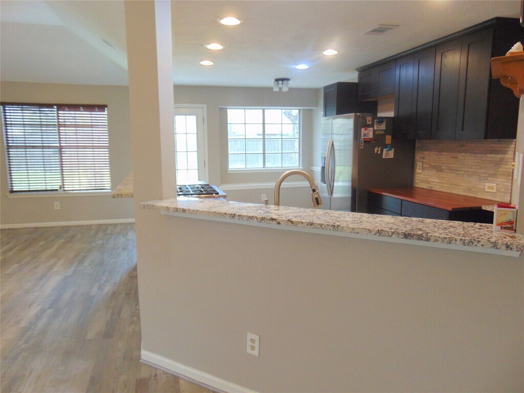 This updated one story home with no back neighbors is light and bright. Entertain with ease with the open floor plan and a 6 burner gas stove w convection. The main bedroom is private and very large with a recently updated ensuite including a glass shower with a seat,2 vanities,and a spacious walk in closet. Go through the back gate to walk or jog along the greenspace. Nestled close to I 45 and FM 518 and League City Parkway,you're a walk to the community pool and tennis courts and close to restaurants and shopping. This could be your home! MLS# 41306759