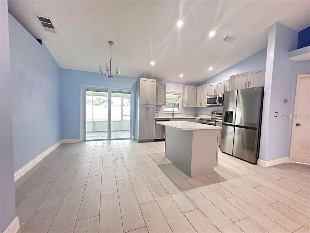 A Beautiful & very Well-Maintained Home! This Gem Features 3 Bedrooms,2 Bathrooms with a 2-Car Garage,Screened Lanai on a Large Lot. No HOA or Fees. Open Floorplan with Vaulted Ceiling and New Vinyl Throughout. Great Room Includes Kitchen,Living,and Dining. The Kitchen updated with stainless steel appliances and has grey Cabinets,with a beautiful cocking island. Large Sliding Glass Doors to the 10x25 Screened Lanai located on a big back yard,little farm back yard! Split Plan with Master Bedroom & En-Suite Bath Includes Walk-In Closet and Updated Tiled Walk-In Shower. 2 Add'1 Bedrooms and Full Bath. 2-Car Garage with Washer,Dryer,and Door Opener. It also Features Screen Enclosed Front Porch Entry. This Home is Light & Bright and Ready for New Tenants! Great Location with Nearby Shopping and Restaurants,The Loop,Florida's Turnpike,e and Easy Access to Theme Parks,Orlando Int'l Airport,Lake Nona Medical City. Live near every MLS# S5142725