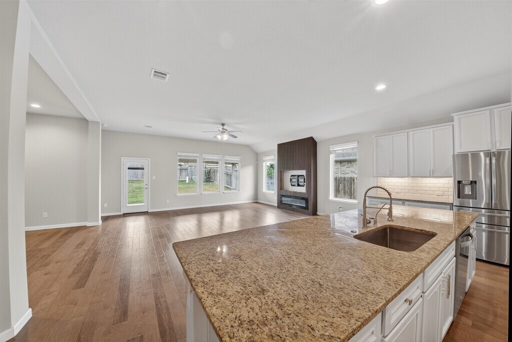 Stunning One-Story D.R. Horton Smart Home packed with upgrades! This 4-bedroom,3-bath home includes a private study with French doors—perfect for a home office. The open-concept layout features a gourmet kitchen with 42" cabinets,under-cabinet lighting,a 10” deep undermount stainless steel sink,spacious island,walk-in pantry,and upgraded Samsung stainless steel refrigerator. Includes washer and dryer. Luxury vinyl plank flooring flows throughout,with carpet in one bedroom and laminate in the others. The garage includes a built-in workbench,and the backyard boasts a storage shed and a large covered patio. Additional features include a sprinkler system,tankless water heater,and doorbell camera. Located in a community with a recreational center,pool,and lake access—plus close proximity to shopping,dining,and entertainment. This home truly has it all! MLS# 84780098