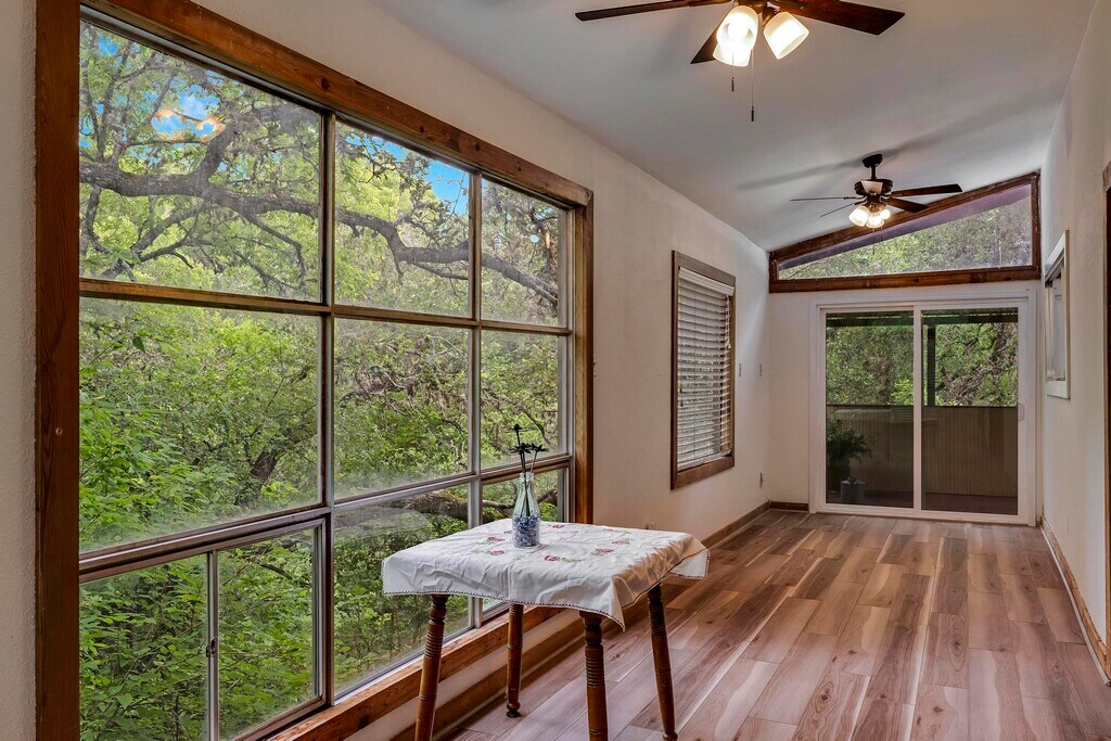 This charming 3-bedroom home is tucked into a wooded, creekside setting in the heart of Grey Forest, offering a rare blend of historic charm and natural beauty. Two of the bedrooms feature cozy personal lofts, ideal for reading nooks, creative spaces, or play areas - while two separate living areas (one on each level) provide flexibility for family living or entertaining. The kitchen includes a breakfast nook with a built-in window seat, and the bright, expansive dayroom offers peaceful views of the Helotes Creek fishing hole. Step outside to a serene backyard shaded by mature trees, where you'll find your own private picnic area under a centuries-old oak, complete with an oversized concrete table, perfect for outdoor gatherings. Located in the historic and artistic community of Grey Forest, highlights of the area include the Scenic Loop Playground, a beloved, community-owned space with a swimming hole, creekside trails, and park areas. The neighborhood is dotted with quaint stone cottages and exudes a relaxed, small-town feel, making it a haven for artists, nature lovers, and those seeking a peaceful retreat. Grey Forest is also proudly designated as a Wildlife Preserve, ensuring the preservation of its natural surroundings and abundant wildlife. This truly unique property is more than a home; it's a lifestyle.