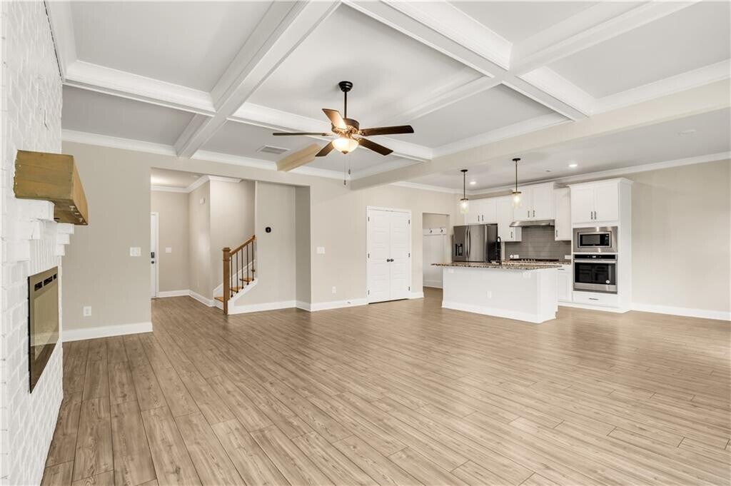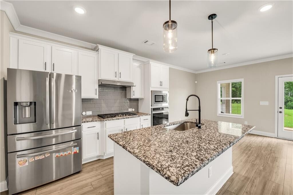 Gorgeous 4 Bedrooms/3.5 Baths with loft upstairs. Pembroke model plus $31,300 worth of upgrade. Open concept on the main level. Great room looking out to the backyard with Allusion recessed electric fireplace. Gourmet Kitchen with extra wide pantry providing easy access,stainless steel appliances,tiled backsplash,granite countertops,huge island with beautiful hanging pendant lights. Mudroom/nook with hanger hooks on one side of garage entrance,keeping room to the other side. EVP flooring on main Level,carpet and tiles upper level. Open handrail on 2nd floor instead of kneewall. Going up the stairs you'll find a loft with window; one secondary bedroom with a large walk-in closet to the right of the stairs; another bedroom suite with double window and its own full bath (tub/shower combo); a third secondary bedroom next to a full bath with double vanity and a tub/shower combo. Master bedroom suite features trey ceiling in the bedroom; double vanity,a sitting area,and a HUGE 7-feet tile shower with dual showerheads and frameless door. Covered front porch and back porch with privacy wall. Front-facing 2-car garage. Community offers swimming pool,easy access to highway,close to dining,shopping,Lake Lanier.