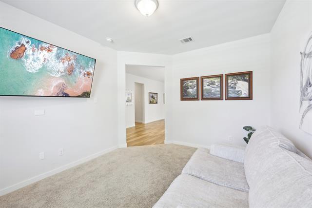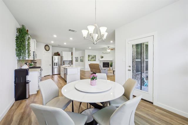 Welcome to this beautifully maintained 4-bedroom, 2.5-bath home in the highly sought-after Wellington community, located within acclaimed Northwest ISD. This expansive single-story layout offers flexibility and function with a formal front living area that can easily serve as a home office, flex space, or even an additional bedroom.Enjoy entertaining in the formal dining room and relax in the large open living area featuring a cozy fireplace and plenty of natural light from the oversized windows. The stunning kitchen boasts white cabinetry, quartz countertops, a gas range, and comes complete with both the kitchen and garage refrigerators.The spacious and private primary suite includes a large ensuite bath, while the secondary bedrooms offer plenty of room for everyone. Additional upgrades include gutters added in 2024 and the washer and dryer are also included. Step outside to a large backyard with a covered patio—perfect for outdoor dining and play. Ideally located close to community amenities, shopping, dining, and major commuter routes. This home has the space, updates, and location you’ve been waiting for—don’t miss it!