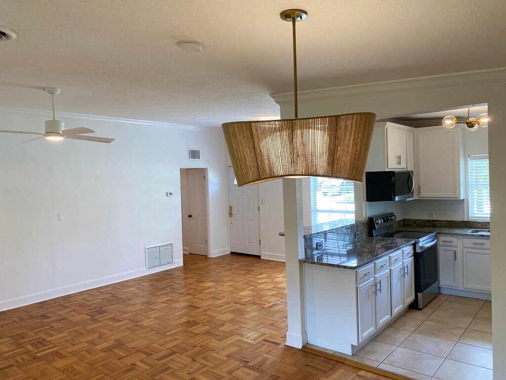 Beautifully updated home in a perfect location in the heart of Winter Park. Brand new stainless steel appliances, new custom countertops, modern ceiling fans, lighting and medicine cabinets. Freshly painted both inside and out including cabinets with new pulls. New coach lights and front door hardware. Immaculate landscaping with huge fenced in backyard and new patio for entertaining. Gorgeous large bonus sunroom which can serve as an office, a playroom or sitting area in addition to three bedrooms and two baths. Covered carport and expansive utility room with washer/dryer and new water heater. This charming, pristine home comes with weekly professional yard maintenance, sprinkler system and pest control. Call Peggy at to schedule a tour. Available 12/13/25.
