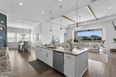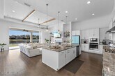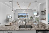 This 4-bedroom, 3-bathroom home offers stunning views! Inside, you'll find a grand entryway, engineered hardwood floors throughout, and an open layout with 12-foot beamed ceilings and a cozy fireplace in the living room. The kitchen is bright and features a large island, ideal for entertaining. The spacious primary bedroom boasts a unique design wall and water views, with three additional bedrooms conveniently located on the same level. This home is fully furnished with DESIGNER FURNITURE! Just a short golf cart ride to the Town Center, Palm Valley Academy, pickleball courts, and Spray+Splash Waterparks. Relax and enjoy breathtaking waterfront sunsets from the summer kitchen and patio.