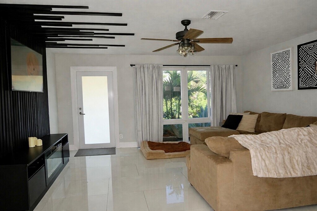 ** Pool Oasis with tropical fruit farm ** 4 Bedroom 2 Bathroom house - Seasonal or Long term available - Pet and Child friendly - Turf and Sauna in Florida Room with acoustic wood ceiling and large floor to ceiling windows/doors - 10+ fruit trees (mango,avocado,jamaican cherries,barbados cherries,starfruit,papaya,Guavas). Tons of yielding fruit! Neighbors will drop off fresh eggs from their chicken. Key West-like vibey neighborhood,lots of boat owners as the neighborhood has a boat ramp,tennis courts and pickleball court. Currently set up as (1 main BR,one guestroom,1 office and 1 kids room). Furniture can stay or leave. Your choice. MLS ID B26020282