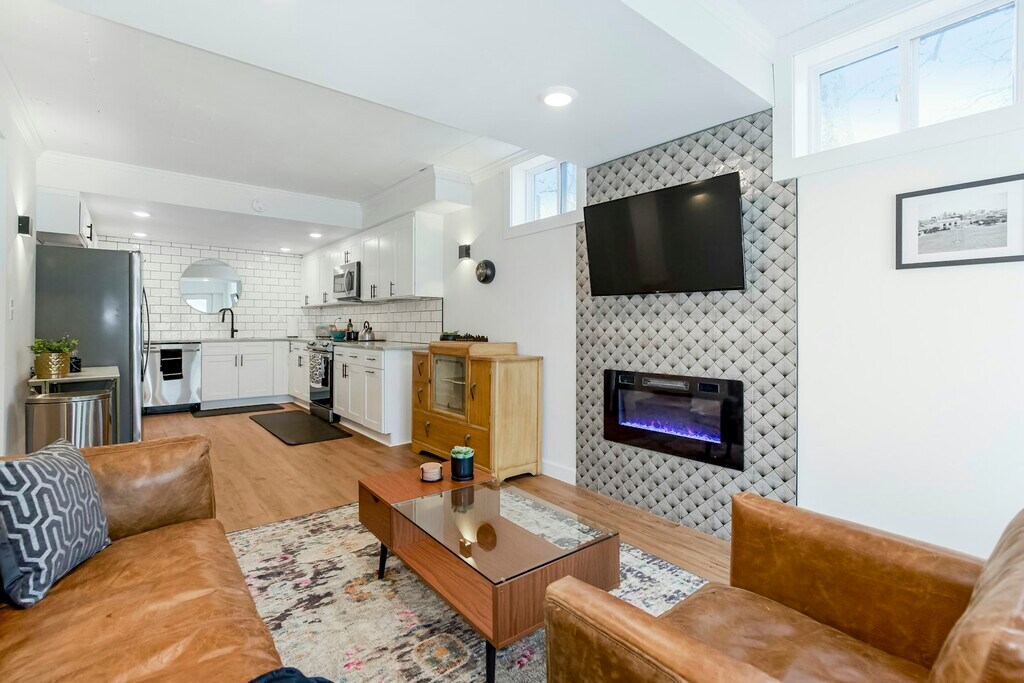 Welcome to this charming basement unit at 1820 W 38th St in Kansas City, MO. This cozy apartment offers 1100.0 sqft, featuring 2 bedrooms and 1 bathroom. Fully renovated and "FURNISHED", it's conveniently located across from KUMED. The bedrooms boast King beds; one includes an awesome built-in "pod" bed, perfect for night shift workers or those craving a cozy private space. Enjoy the brand new kitchen with stainless steel appliances, and a bathroom featuring an art deco themed vanity and spacious shower, plus a full-size washer and dryer. Relax by the electric fireplace or open the patio doors for fresh air. One off-street parking space is available directly outside. Nestled in a desirable, safe neighborhood, this property offers easy access to local amenities, dining, and entertainment. Lease options available, with furnished options starting at $2,100/m for a 6m to 1-year lease, including utilities OR $ 2,500/m for month to month basis. Additional services like bi-weekly cleaning and extra parking are also available. No pets allowed due to noise restrictions, ensuring a peaceful environment.