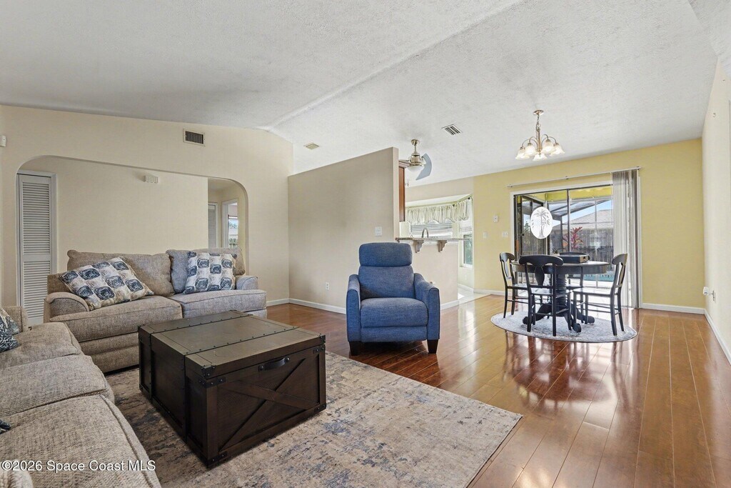 Nestled in the desirable NW Palm Bay community on a fully fenced corner lot,this charming split floor plan,3-bedroom,2-bath offers the perfect blend of comfort and Florida lifestyle living. This laid-out living space,the inviting open floor plan is filled with natural light and features laminate flooring in the main living areas and tile in the wet zones,creating a warm and welcoming atmosphere. The eat-in kitchen with a breakfast bar flows seamlessly into the living area,ideal for everyday living and entertaining. Step outside to your private screened-in pool and expansive tiled porch -- an entertainer's dream and a serene spot to relax year-round. Practical upgrades such as a newer roof and hurricane shutters on all windows provide peace of mind,while the 2-car attached garage and ample driveway offer plenty of parking. Also listed for sale,very pet friendly rental. MLS # 1071492