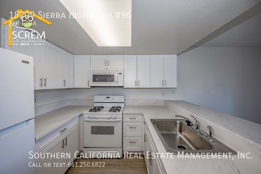 Beautifully updated two-bedroom, two-bathroom condo located in a gated community in Canyon Country. The open living and dining room features modern vinyl plank flooring, a ceiling fan, a cozy corner fireplace, and a sliding glass door that leads to the front entrance with lovely mountain views. The recently updated kitchen features quartz countertops, white soft-closing cabinets and drawers with brushed-silver hardware, a breakfast bar that opens to the living area, and all essential appliances, including a gas stove, single oven, microwave, dishwasher, and refrigerator. The primary bedroom includes vinyl plank flooring, two spacious closets, and an attached updated bathroom with a newer vanity and a walk-in shower. The guest bedroom is spacious and sits next to an updated full bathroom with a new vanity. Additional conveniences include a stackable washer and dryer in the hallway and an attached two-car shared tandem garage. Water and trash are included in the rent. *Owner may consider a small pet. For inquiries about this property, please email . To schedule a viewing appointment, visit