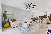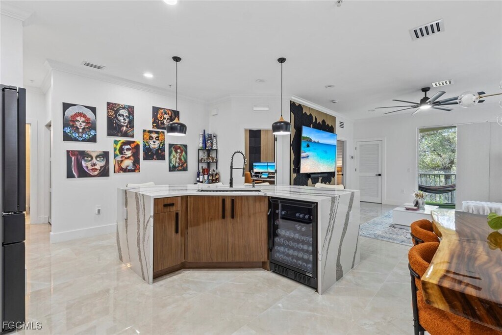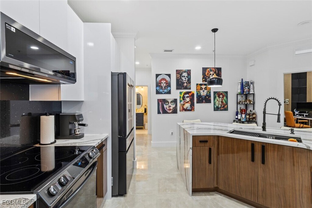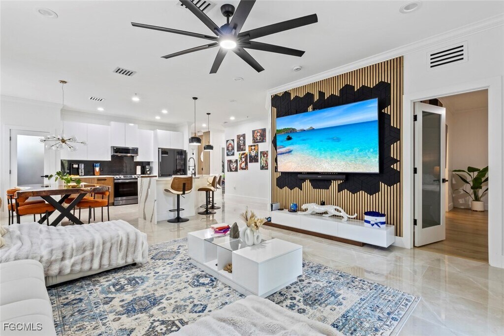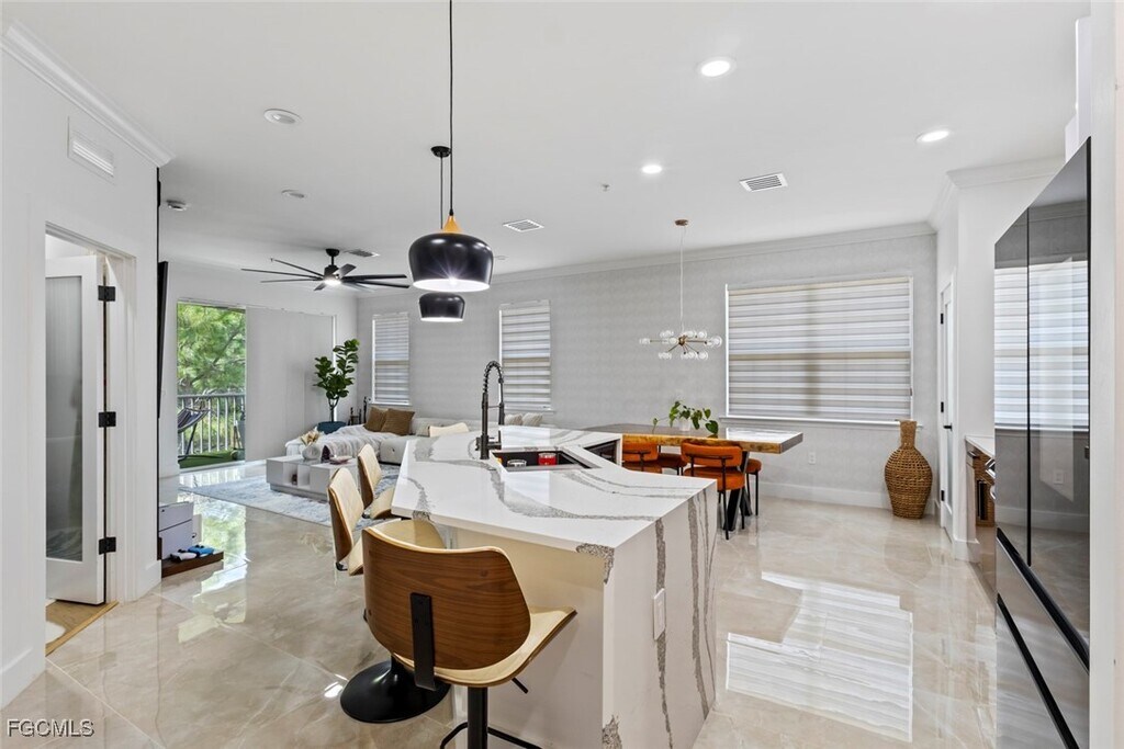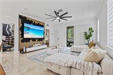 This stunning coach home end unit offers everything you've been looking for. Featuring an open,one of the biggest floor plans,it boasts 3 bedrooms,a den,2 bathrooms,and a one car garage. Exquisitely remodeled with high end finishes and exceptional attention to detail,this home showcases modern elegance throughout. The main living areas are highlighted by porcelain tile flooring,bedrooms with luxury wood like laminate. The chef inspired kitchen is equipped with brand new modern cabinetry,a beautiful waterfall island with pristine quartz countertops,and updated plumbing,including a new garbage disposal,sink,and faucet. Both bathrooms have top of the line fixtures,frameless glass shower doors,and luxurious touches. New ceiling fans,stylish light fixtures throughout,and custom wood accent panel doors add the finishing touches to this stunning home .Key upgrades include a brand-new A/C system and water heater (both replaced in 2024) and roof. The HOA provides comprehensive coverage,including building insurance,flood insurance,exterior pest control,building maintenance,lawn care,and reserves. Residents can also enjoy access to the community pool,fitness center,and clubhouse. Short distance from Fort Myers International airport,FGCU university,Gulfcoast Town Center,Miramar mall and Coconut Point. Don’t miss the chance to own this beautifully updated home schedule you're showing today!