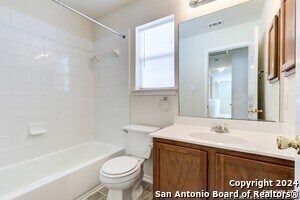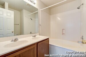 Welcome to this stunning two-story home located in the highly sought-after Wolf Creek subdivision. As you step inside, you'll be greeted by a picturesque entryway, featuring soaring ceilings and exquisite architectural details that set the tone for the rest of the home. The main level hosts the primary bedroom, a tranquil retreat with an attached ensuite that boasts a double vanity and a relaxing garden tub. There's also a convenient powder bathroom for your guests. Upstairs, you'll find a versatile second living area, perfect for entertainment or relaxation, along with two additional bedrooms. The spacious backyard, complete with a privacy fence, offers an ideal space for outdoor enjoyment. With easy access to 1604, the 151 business corridor, Lackland AFB, and more, this home is perfectly situated for your convenience and daily activities. Experience comfort, style, and convenience all in one place.