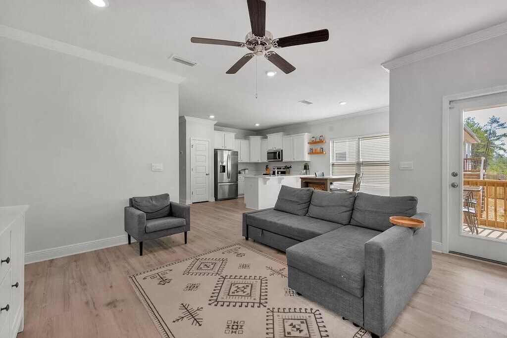 Beautiful well maintained home in Hammock Oaks available January 1. The Monroe plan is a 3 bed, 2 bath, 1 car garage home in Hammock Oak Estates. As you enter through the foyer, there is a hall that leads to the kitchen area on the right and the stairs to the second floor on the left. Continuing past the kitchen is the living and dining room area, and the backdoor entrance for the covered porch. Once you head up the stairs, you'll have bedroom #2 and #3 on your left, with the main bedroom on the right, two walk in closests on your left, and a doorway to the balcony within the main bedroom. The home offers quartz countertops with pearl EVP flooring throughout the home and ivory painted cabinetry. Hammock Oak Estates is nestled among the beautiful pines just north of the Choctawhatchee Bay in Freeport, Florida.