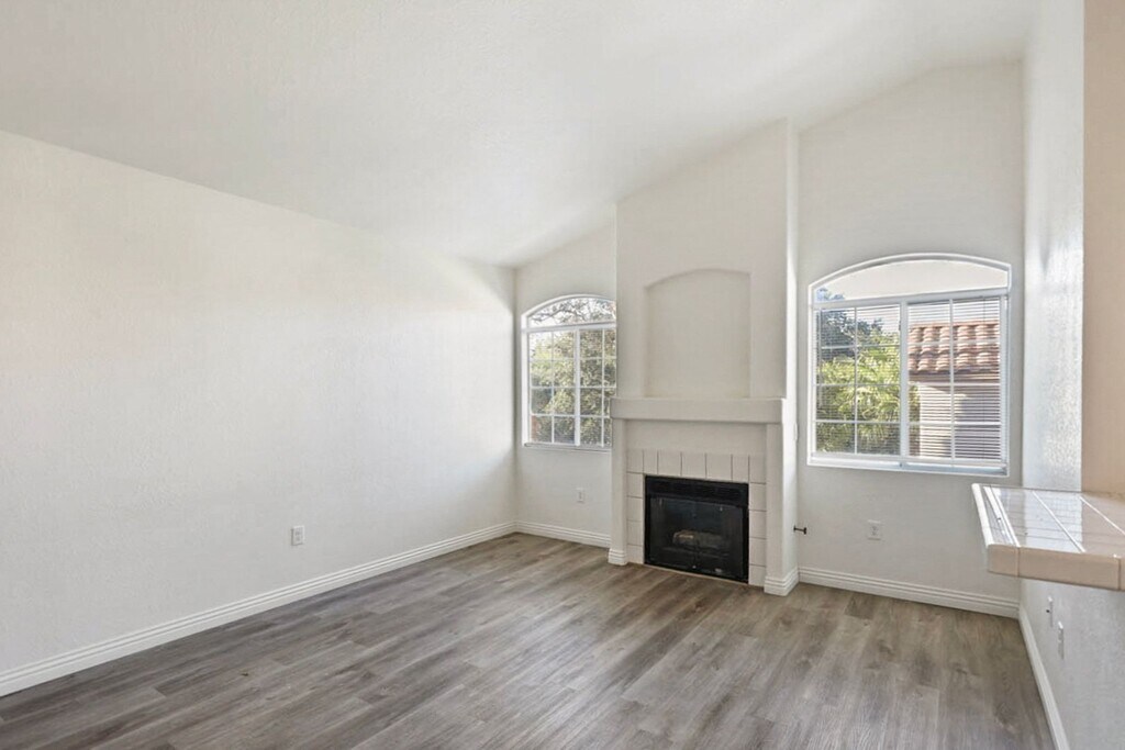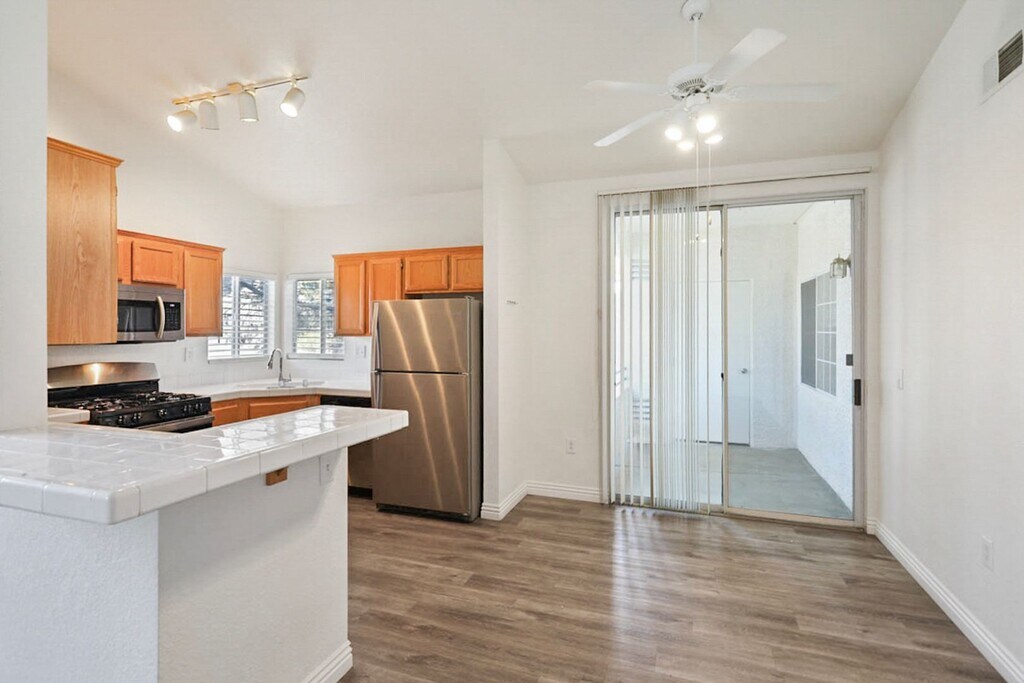 Gated community w/ community pool, park, playground, exercise room, picnic areas; Convenient to the Summerlin Pkwy; Luxury vinyl plank flooring throughout; Living room w/ fireplace; Kitchen w/ breakfast bar, stainless appliances including refrigerator & microwave; Dining area with ceiling fan and light; Covered balcony; Primary suite w/ ceiling fan and light, cable outlet, large shower; Laundry closet w/ full size washer/dryer; Full guest bath; Guest bed w/ ceiling fan, light, cable and closet; 1 car garage attached but no entry to unit with auto door; Convenient to shopping and dining!