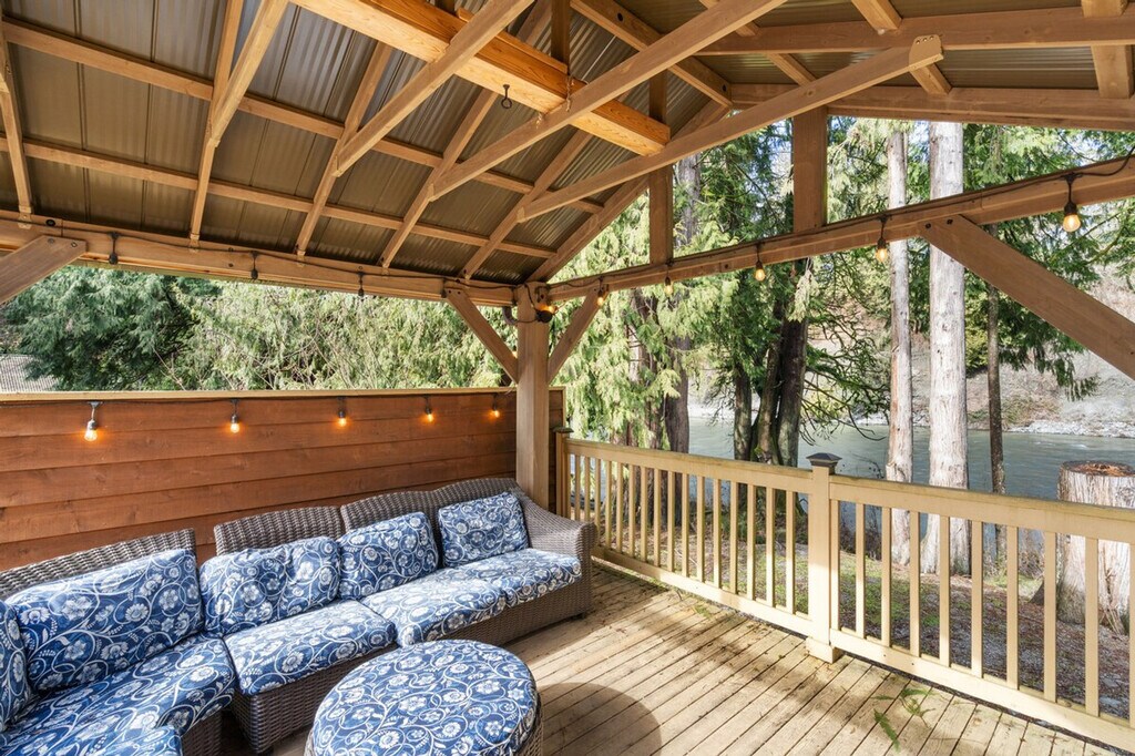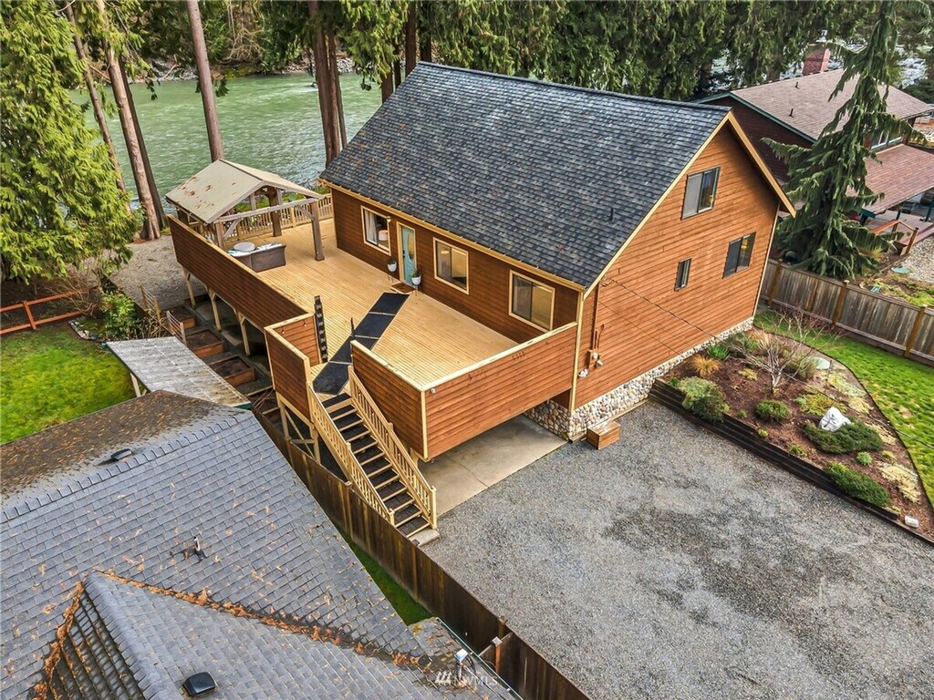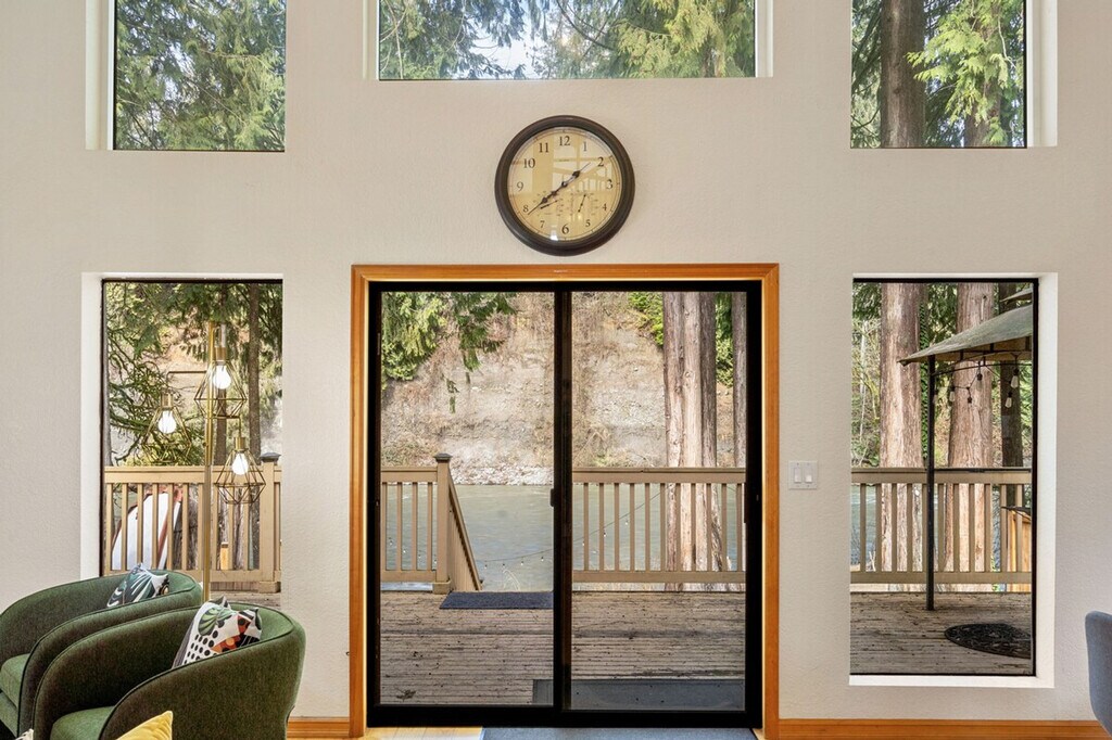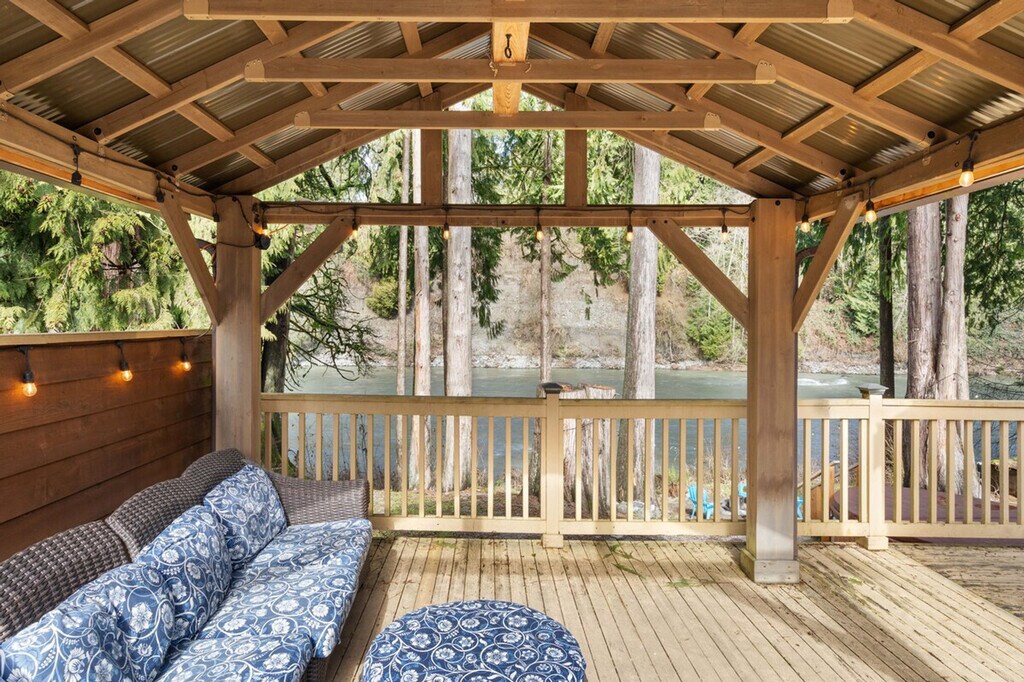 Feel at home in this picturesque riverfront home, nestled on the banks of the Stillaguamish River. This home offers 4 bedrooms and 2.5 bathrooms. With the river flowing right through the backyard, this home offers a perfect blend of nature and luxury. The entrance opens to an open kitchen concept, tall ceiling living room with sliding doors leading to the deck and hot tub overlooking the river, all illuminated by hanging lights. The kitchen is well-appointed with every essential, and there's space to dine and hang out at the breakfast bar and the window-side table. The basement with its separated entrance has a karaoke set-up, dancing pod area, bar, a movie theater room and a cedar sauna. A cedar hot tub overlooks the river. There is a huge front yard and driveway for all your parking needs. You can even park multiple RV's if you want. This home is 5 mins from the town of Granite Falls and 20 mins from the Mt. Baker-Snoqualmie National Forest. In the cascades you will find some of the best hiking and most beautiful natural features that Washington has to offer, including Gothic Basin, Big Four Ice Caves, Mt. Pilchuck Fire Lookout, Lake Twenty-Two, and Heather Lake. Other outdoor recreation activities in the area are endless as well, including hiking, whitewater kayaking, river tubing, backcountry skiing, and fishing. The sauna, movie theatre and one bedroom is on a different floor with a different entrance in the basement. The 3rd floor (one bedroom with 3 beds) is only accessible via the spiral staircase. Any use of fireworks anywhere near the house will result in a $1000 fine. Do NOT try parking under the deck, it's not tall enough. [SI]
