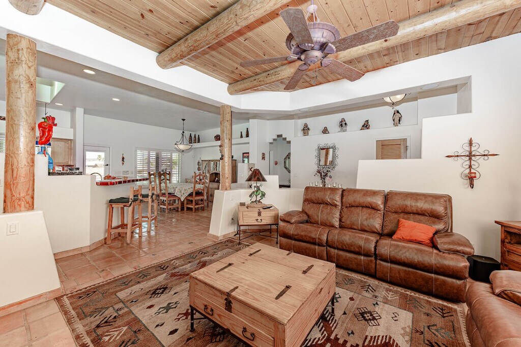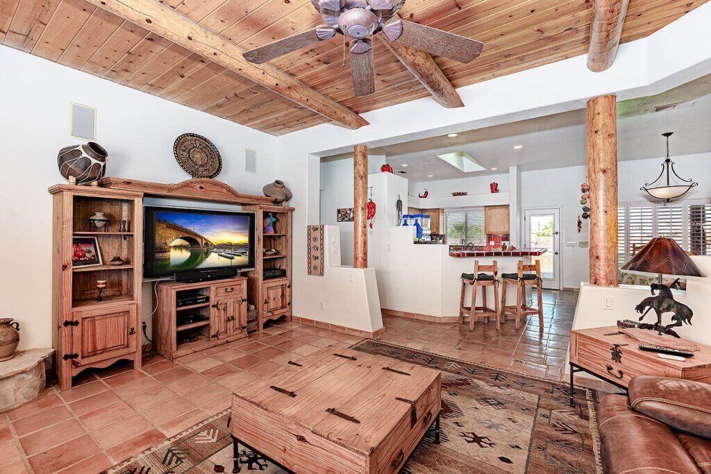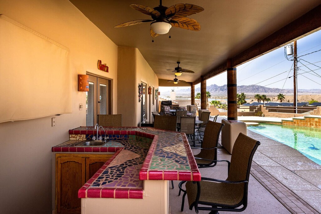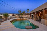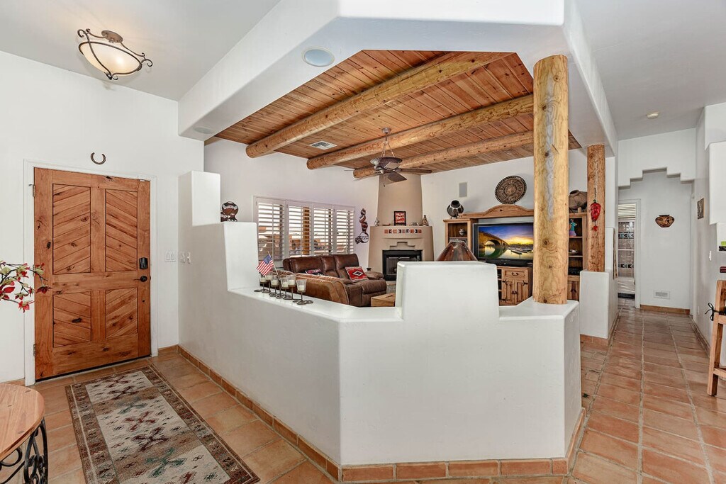 Experience true Santa Fe charm in this beautifully appointed home featuring Saltillo tile and 10-ft ceilings throughout. Enjoy lake views from both the front and back yards, plus a resort-style backyard with a pool, spa, outdoor shower, and built-in bar. Relax on the expansive 550 sq ft covered patio or in the spacious master suite with French doors leading to the pool. Tongue and groove wood ceilings in the living room add warmth and character. A perfect retreat for relaxation and entertaining. LIVING ROOM >Smart TV (login to own streaming apps) >Comfortable couch seating, recliners! >Fireplace DINING ROOM >Seats 6 people KITCHEN >Keurig/drip dual coffee maker >Fully stocked (pots/pans/utensils) >2 barstools are counter BEDROOMS (Sleeps 7) >Bedroom 1: Queen bed, mirrored closet slider >Bedroom 2: King bed, Smart TV, walk in closet, french doors with outdoor access, twin rollaway >Bedroom 3: Queen bed, mirrored closet doors, french doors to outside *Washer and dryer in house with supplies BATHROOMS >Bathroom 1: Double vanity, walk in shower, ensuite to bedroom 2 >Bathroom 2: Shower/tub combination, hallway bathroom BACKYARD >Heatable pool* (see "other things to note") >Fully fenced >Pool umbrella >Covered kitchen, Smart TV >Covered dining table >BBQ grill >Outdoor shower PARKING >Plenty of driveway parking Guests will have access to the entire listing except the garage. We want your vacation rental experience to be memorable and convenient. Keeping a comfortable and clean property is what is most important to us. We will be available anytime via messenger to answer any questions or concerns. We take the approach of being hands off on the property unless needed - we want you to feel like you have the home all to yourself! OTHER THINGS TO NOTE >Must be 25 years old to book >No parties >No events >No smoking inside >Quiet time after 10pm (includes loud voices/music) - Per city ordinance >No unauthorized guests other than those on the reservation >Monthly rental November to March. This home is not available for a long term lease POOL HEATING >$125/day to heat the pool (full stay required) >It can take 1-2 days to heat the pool so we need advanced notice PETS >Max 2 pets allowed >$25/night per pet >Pets must be accompanied at all times, picked up after, and not allowed in pool CAMERAS >Front door >Back patio >Pool backyard area ...in place for safety and security reasons. Do not tamper with DEPOSIT >We may ask for a $250 deposit hold, or $500 for holidays LEFT BEHIND ITEMS >$20 service charge added to shipping cost TPT#21607859 VR25-00889 CREDIT CARD PROCESSING FEES Note: When making a reservation through our website or when using credit card payment there is a 4-6% credit card processing charge that is paid to Stripe (the credit card processing company). If AT ANY TIME there is a cancellation, the 4-6% charge is not refunded. DAMAGE PROTECTION The extra charge listed as “Waivo Insurance” on your reservation covers accidental damage in the home within a certain limit. If something happens or breaks during your stay please let us know immediately so we can file a claim. Note: This amount only covers a 10 day or less stay. If you are staying longer than 10 days we will request the difference in amount for coverage. MARRIOTT GUESTS -- You are not charged a Waivo Fee. You will be asked to upload your credit card information to the reservation upon booking, this will act as the card on file (similar to hotels) in case any damages occur during your stay.