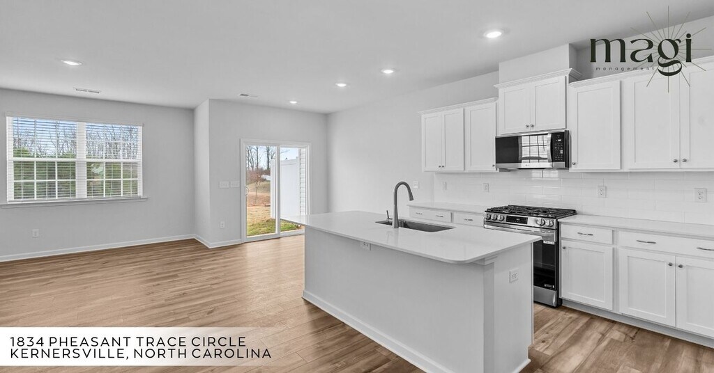 Brand-new end-unit townhome built in 2025 in Forsyth County, featuring 3 bedrooms and 2.5 bathrooms with over 1,600 sq. ft. of modern living space. The main floor offers an open-concept layout with durable LVP flooring, a spacious white kitchen with full-size stainless steel appliances, and a large island perfect for entertaining that overlooks the living area. Upstairs, you'll find three bedrooms and the laundry area for convenience. The back patio and yard include a side-wall privacy fence and overlook a water retention pond, providing a serene connection to nature. Commuting is easy with access to 421, I-40, and Highway 74, giving quick routes to Greensboro, High Point, and Winston-Salem. Shopping, dining, medical offices, and local favorites are nearby, and Downtown Kernersville is less than 10 minutes away. Washer and dryer are included. No smoking; pets considered on a case-by-case basis.