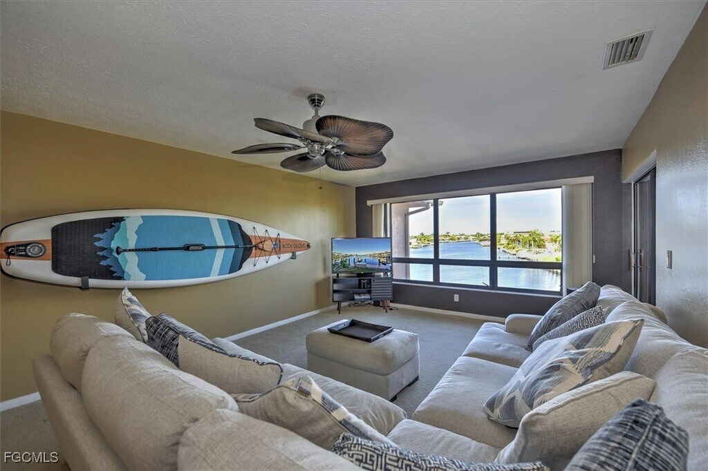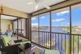 STUNNING PANORAMIC VIEWS from almost every room of this beautiful and desirable corner unit. This condo offers the best views in the complex allowing you to easily see the frequent Dolphin visits and many other marine life,including Manatees. Situated at the end of a huge intersecting 200' wide,deep water Sailboat Access canal; just minutes to the Caloosahatchee River where you can enjoy a day of boating,fishing and dining. Park and keep your boat docked in one of the available slips right in your own backyard. Enjoy a walk to Jaycee Park just two blocks away. This updated unit features 2 bedrooms,2 baths,screened in lanai,and rare waterfront views from "both" front and rear of unit. Re-piped -,Hurricane Windows- New Roof plus reserved parking and extra storage.Full Background and HOA Application Required