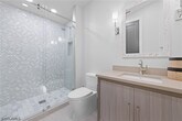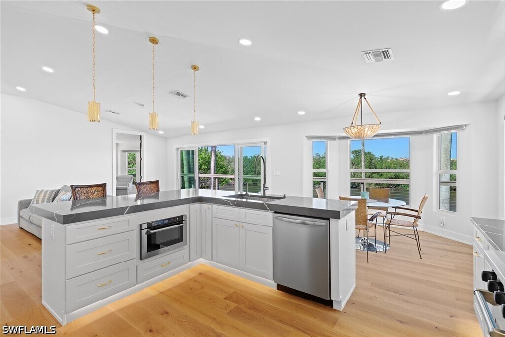 Completely renovated waterfront residence ideally positioned just minutes from Naples Bay and the world-class dining,shopping,and entertainment of 5th Avenue South. This exceptional two-story home offers a versatile layout designed to accommodate a variety of living arrangements. The upper level serves as the primary living space,showcasing a spacious open-concept design with an expansive living area,a beautifully appointed kitchen,powder bath,and three generously sized bedrooms—each featuring its own private ensuite bathroom. The lower level is perfect for guests or extended stays,offering a large secondary living area,a private bedroom with ensuite bath,and a well-equipped kitchenette complete with an under-counter wine refrigerator and microwave. High-end finishes are featured throughout,including neutral wood flooring,custom tilework in all bathrooms,and a striking custom wood ceiling detail in the main living area. The chef’s kitchen is designed for both functionality and entertaining,highlighted by a 48” gas range,a 54” side-by-side refrigerator/freezer,and an oversized L-shaped island. Seamless indoor-outdoor living is achieved through two expansive rear decks,both offering unobstructed water and serene mangrove views. Additional features include impact-resistant windows and doors,a circular driveway,ample garage storage,custom lighting,furniture-style bathroom vanities,and ventilated closet shelving.