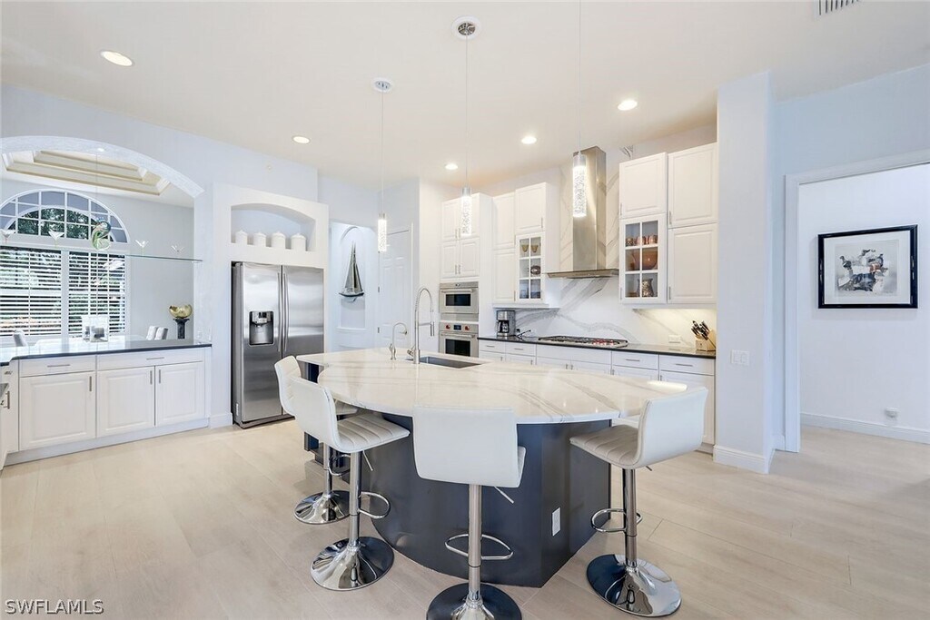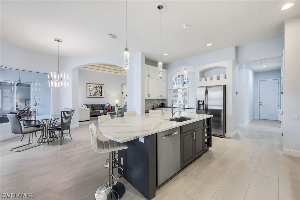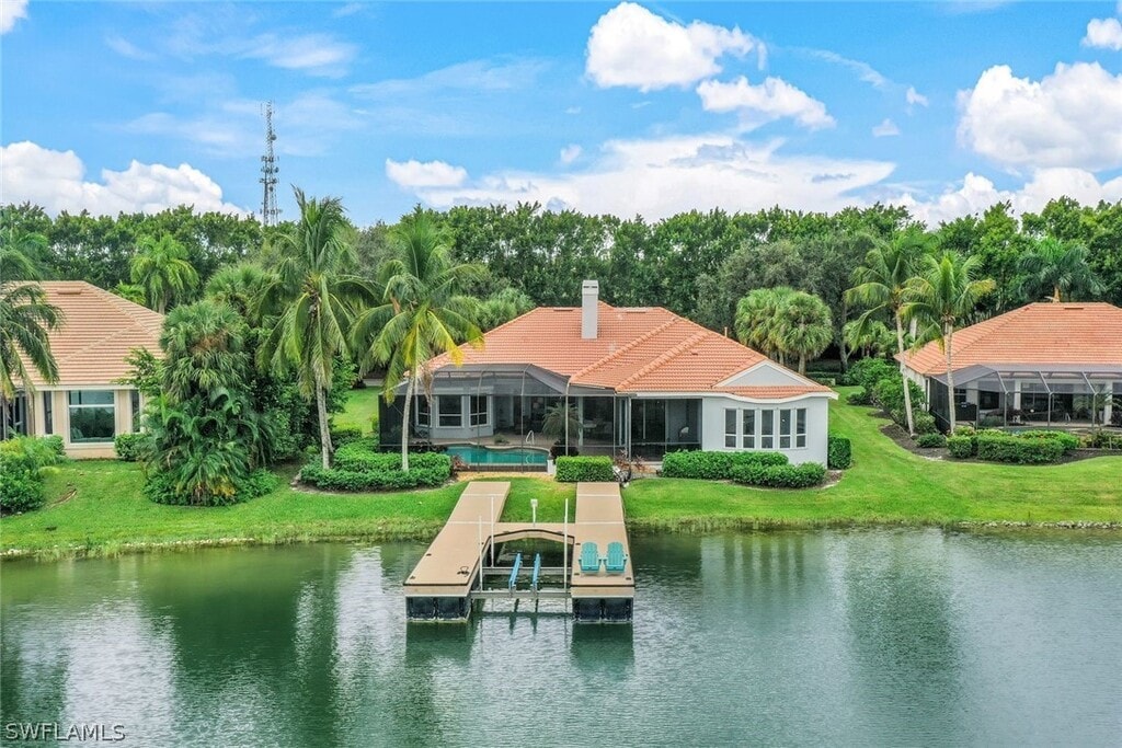 Stunning waterfront living! This beautiful estate home on the water is a harmonious synthesis of thoughtful design and refined amenities.Sophisticated elements and a contemporary flair create an elegant yet comfortable atmosphere throughout this exceptional 4-bedroom,3 bath residence Den/Florida room and Home Office with a private boat dock for direct access to Miromar’s 700 acres of freshwater lakes. An inviting space for entertaining,the stylishcovered lanai encloses an outdoor kitchen with several outdoor seating options near the pool and spa. The handsomely equipped indoorgourmet kitchen features a breakfast bar and a nook with 2 newer wolf appliances,Bosch dishwasher and recently renovated countertops andcabinets. Bask in the serenity of evenings dining "al fresco” or entertain inside in the formal dining room and living room. The luxurious mastersuite is highlighted with a bay windowed sitting room overlooking the pool and water. Residents enjoy Five-Star resort facilities including infinity pool,tennis courts,championship golf course,gourmet restaurants and a full-service wellness spa.