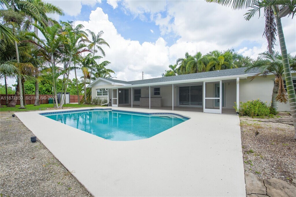 Spacious 4/2 rental in Gerardmere Acres! Features a cozy living room w/laminate floors, decorative fireplace, and recessed lighting. Large family room opens to pool & patio. Kitchen offers stone countertops, eat-at counter, pantry, SS appliances, & double sink. Tile dining room, 1-car garage w/W&D, storage, and A/C handler. Master suite with walk-in closet, private bath, and sliding doors to patio. Three additional bedrooms with laminate floors, fans/lights, and closets. Guest bath w/double sinks, shower, patio access. Screened patio, summer kitchen, pool w/cool decking, fully fenced yard, carport, fruit trees, alarm-ready, electric gate, no HOA, and new roof! MLS # A11877150