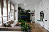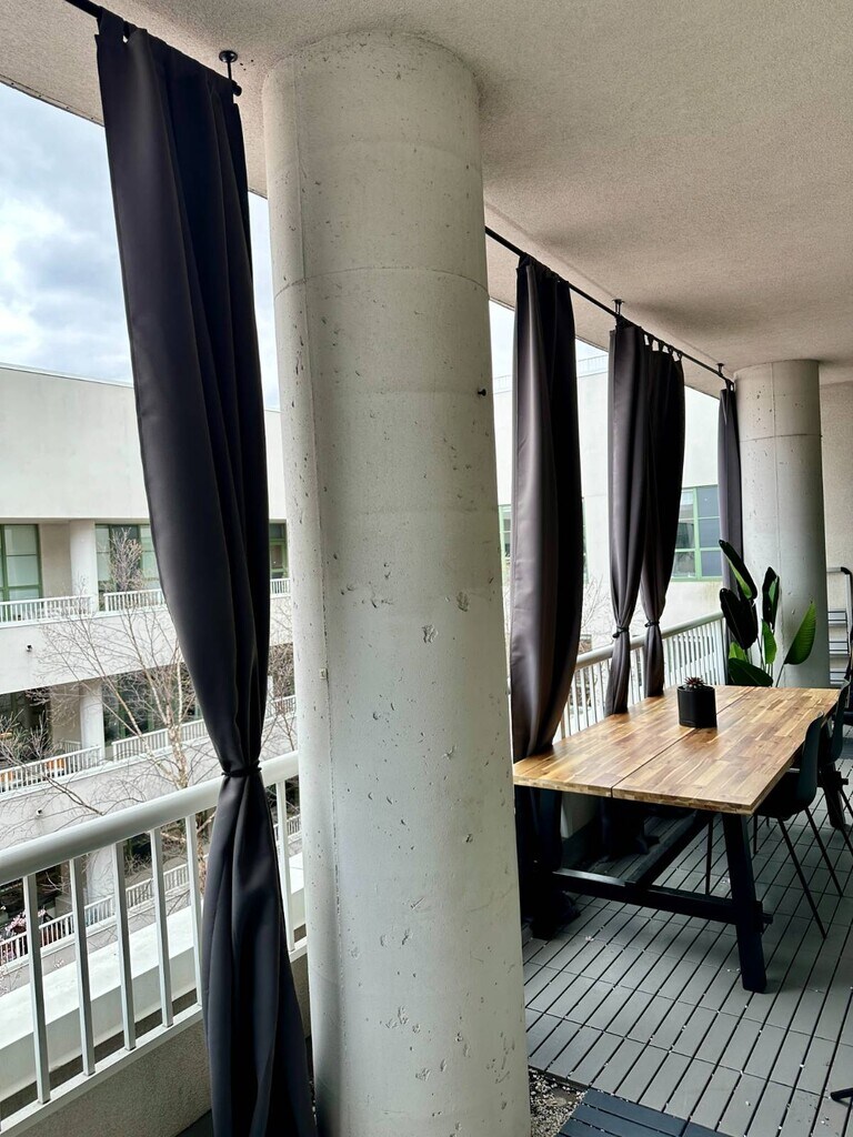 Spacious, bright, quiet, luxury 513-square foot studio with 14-foot ceilings on top floor. Large walk-in closet with built-in Vitsoe shelves. Central air. Contemporary high-end appliances including washer and dryer. Remote-control window shades. MASSIVE private terrace (21' x 6') overlooking garden courtyard. This is the most coveted line for loft studios at Austin Nichols House due to the unique layout and terrace. Terrific for social get-togethers or relaxing away from city life. Renovated. Closet walls and foyer have been painted brown and green/blue yet can easily put back to white or other color. Pet-friendly, fully staffed building with spacious lobby, gym, and many other amenities (see Austin Nichols House building description). Parking garage in building. Vibrant neighborhood bustling with restaurants, coffee shops, and stores. Across the street from Trader Joe's and 3 blocks from Whole Foods. 6 blocks from the L train - one stop to Manhattan. Showings available Wednesday through Sunday with 48 hours' notice. Flexible start date. Flexible on Price and Terms