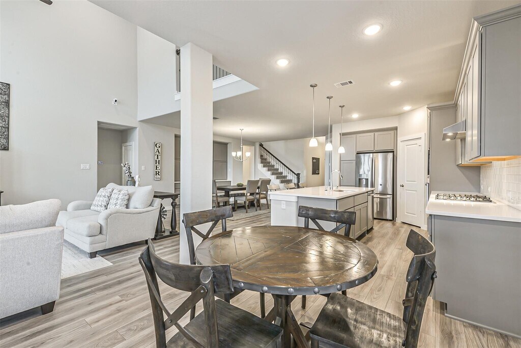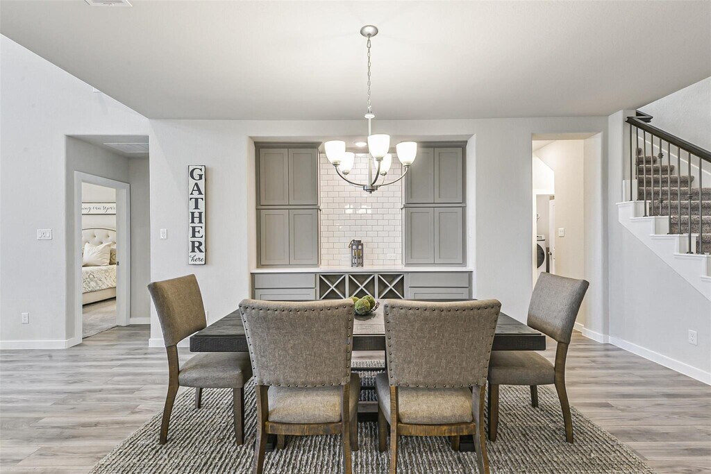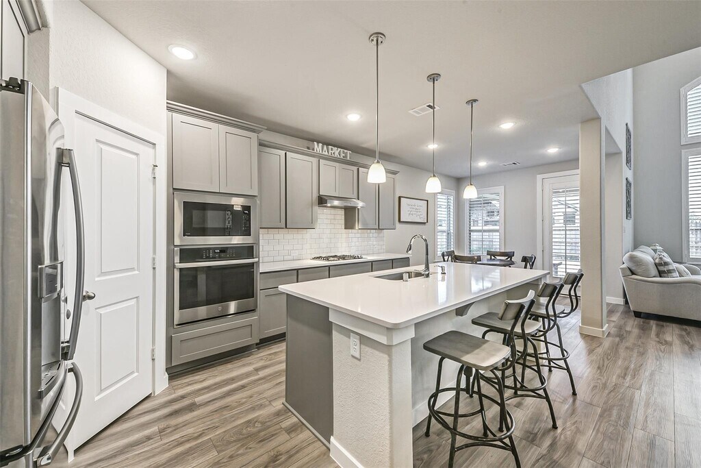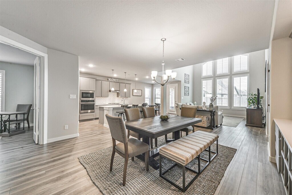Stunning two-story home in the highly sought-after master-planned community of Aliana. This beautifully designed home features an open-concept layout with a dramatic two-story family room,private study,4 bedrooms (2 downstairs),3 full baths,a game room,and a media room. Upgraded throughout with plantation shutters and wood-look tile flooring in all living areas and bathrooms. The chef-inspired kitchen features a large island,stainless steel appliances,and sleek countertops. The dining area includes a built-in serving bar with wine storage. The family room boasts soaring ceilings and a wall of windows filled with natural light. The private study with French doors is ideal for working from home. Enjoy a covered and extended backyard patio plus a charming covered front porch. Located in Aliana with resort-style amenities and easy access to 99 & 59. Move-in ready,exceptionally maintained,and a rare lease opportunity. Don’t miss it. MLS# 53732417
