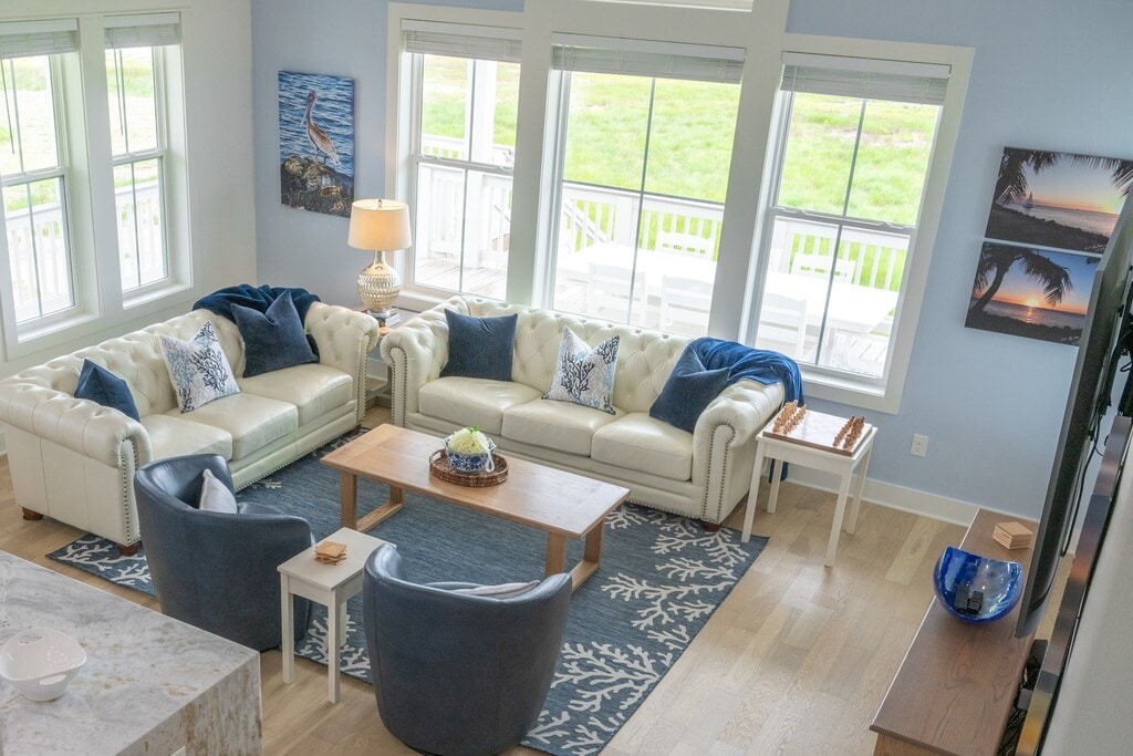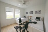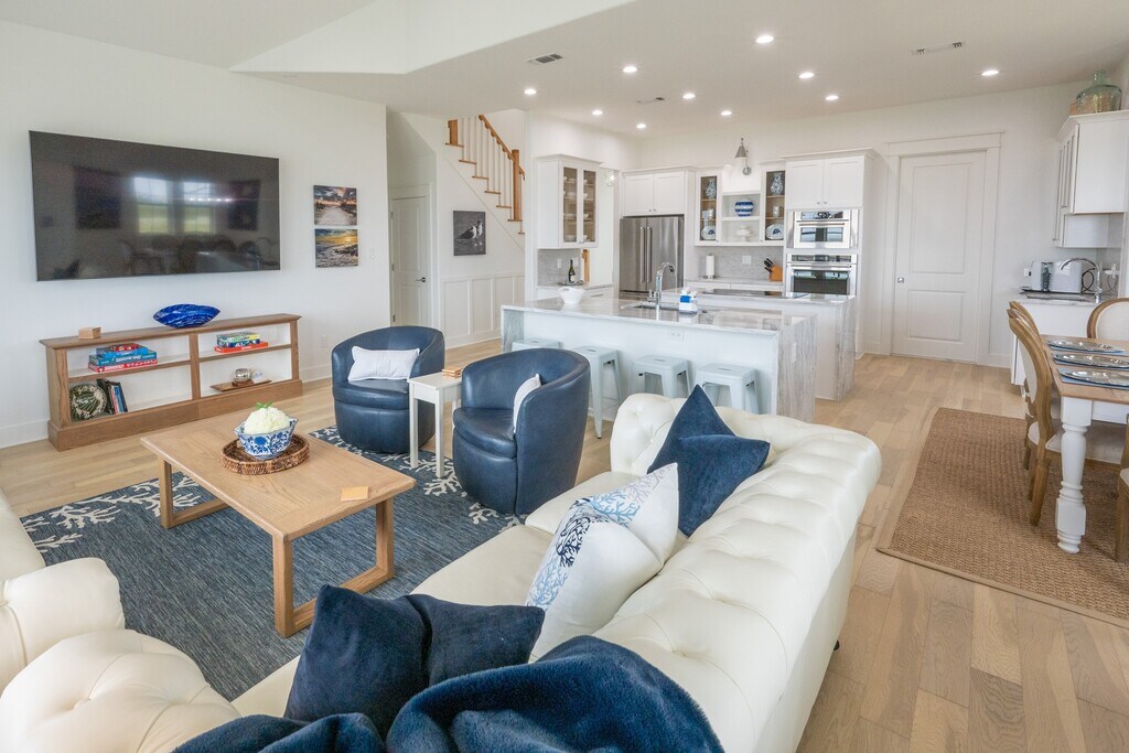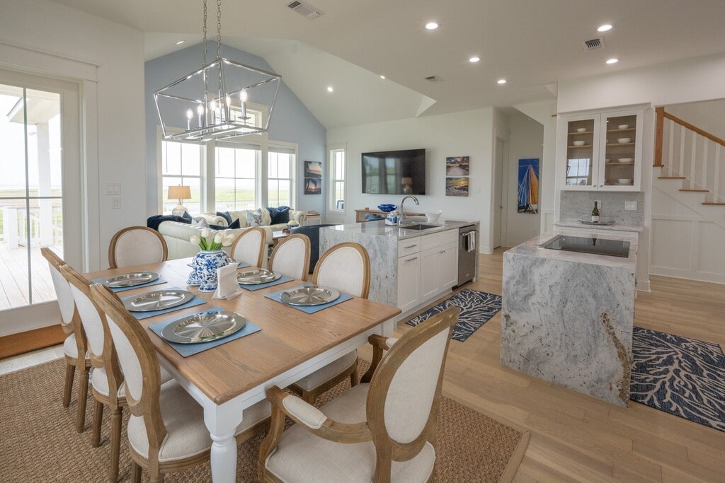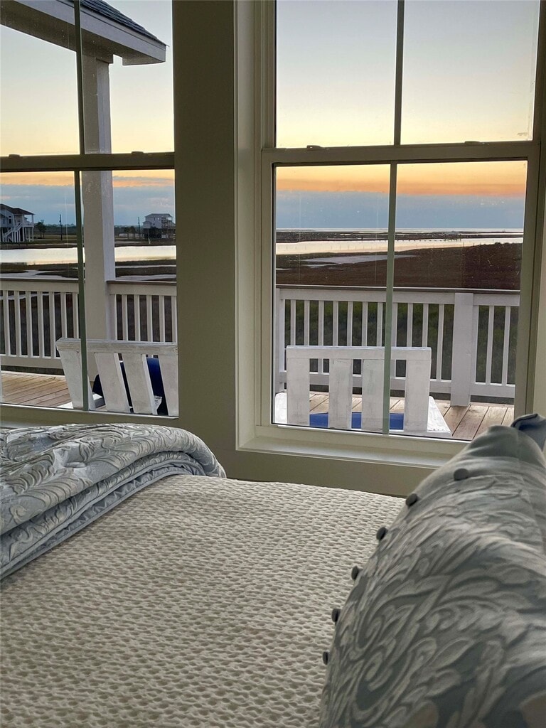 Construction completed December 2023,this home sits on an open 1.76 acres at the end of a cul-de-sac and offers unobstructed breathtaking views of the West Galveston Bay sunsets. Open concept living area,kitchen with two waterfall marble islands,beverage center and Kitchenaid appliances. Marble countertops,wood and tile flooring throughout the home. The abundance of windows offer inflow of natural light to the 14' vaulted living area and enhance the open concept coastal styling and panoramic water views. The full-width rear balcony offers a covered space for dining and relaxation as well as an uncovered space for enjoyment of the sunshine. Home is fully furnished and also includes golf cart for immediate enjoyment. Short walk or golf cart ride to the beach as well as access to the bay. MLS# 33594053