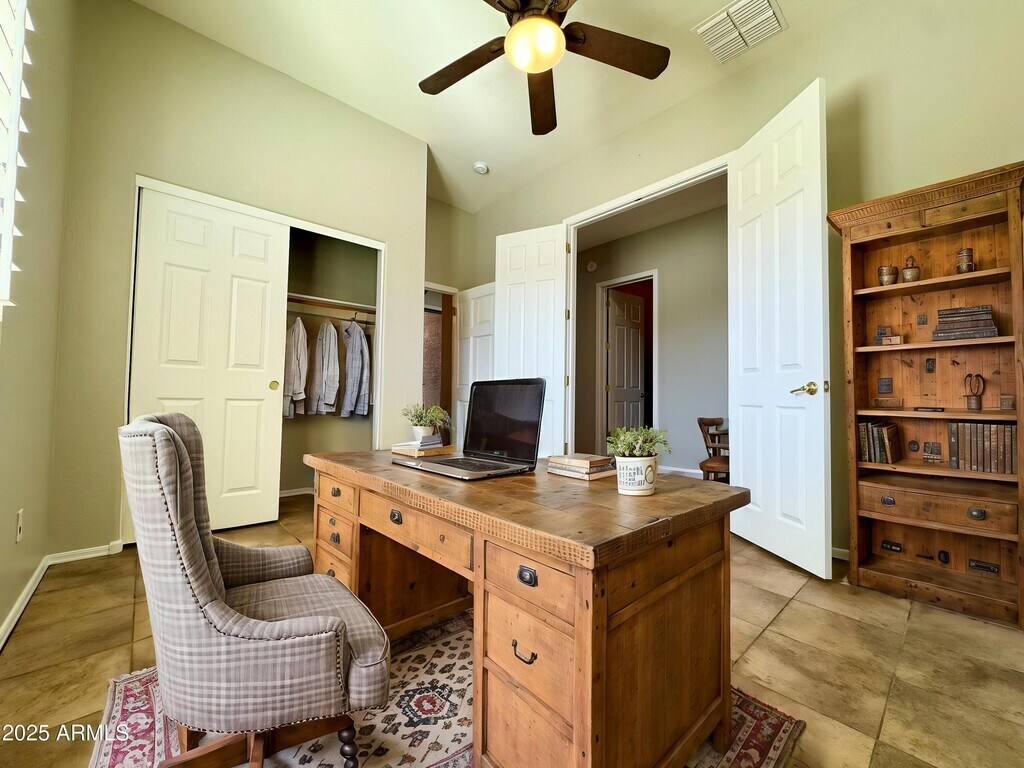 Beautiful 3-Bedroom Home with Pool & Spa in Estrella Mountain Ranch. This 3-bedroom,2-bath home is located in the highly sought-after Estrella Mountain Ranch community. Boasting 10-foot ceilings and tile flooring throughout,this spacious home includes a 3-car garage with built-in cabinets for extra storage. The large kitchen features Corian countertops,stainless steel appliances (including a brand-new gas range and refrigerator),and stunning staggered cherry cabinets with under- and over-cabinet lighting. Plantation shutters throughout add elegance and privacy. The open-concept living room includes a cozy gas fireplace and a custom entertainment niche. A large Arcadia sliding door provides access to the backyard oasis,complete with a sparkling Pebble Tec pool with service included! Monthly Yard Service Included!