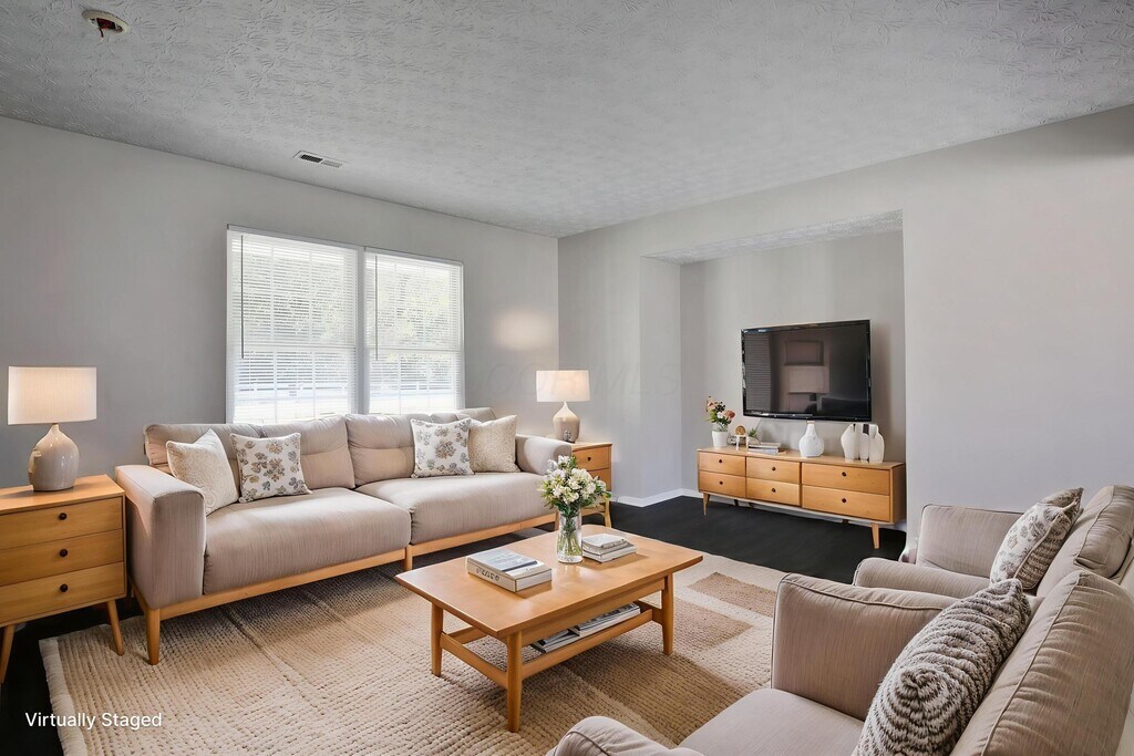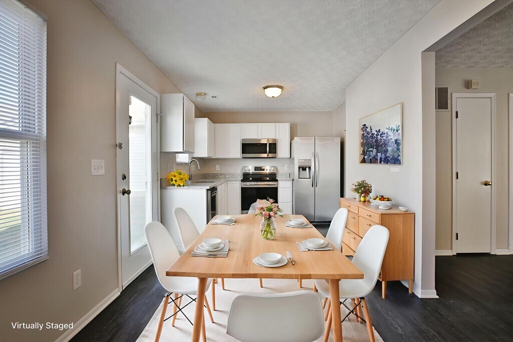 FOR RENT! Updated and charming 3 Bedroom,1.5 Bath,2-story home with a lot to offer! Newer floors in the entire house lead to the bright living room that carries through to the kitchen on the first floor. The eat-in kitchen and dining area is equipped with newer stainless steel appliances and an abundance of cabinets. Half bathroom on the first floor. The second floor has 3 good sized bedrooms,including a vaulted master suite with large walk-in closet. 2nd floor laundry room & washer/dryer connections. Full bathroom upstairs. Nice backyard with patio and 2 car garage and extra parking space. The HOA mows the lawn. Residents are responsible for utilities and maintaining flower beds. 2 mins to Ohio Dominican University,7 mins to Easton,6 mins to 670,10 mins to CMH airport and very convenient to freeways and local amenities/shopping.