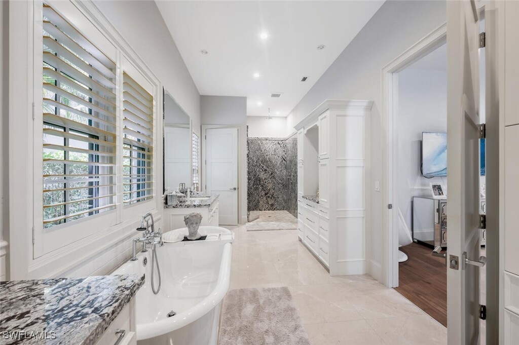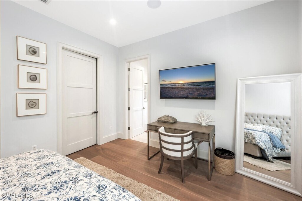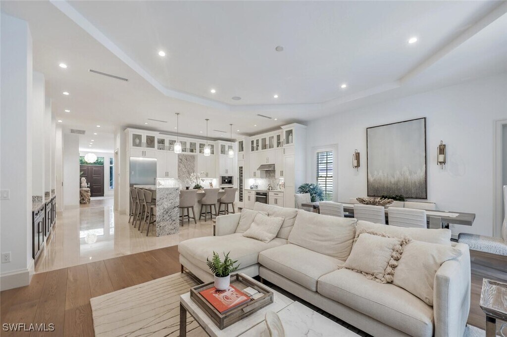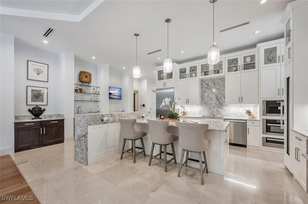 Nestled in the highly desirable neighborhood of The Moorings,this 5-bedroom,6-bath home with a den is an ideal winter retreat. The area is renowned for its scenic,tree-lined streets,quiet atmosphere,and proximity to popular shopping,dining,and entertainment,offering a perfect balance of coastal convenience and charm. Upon entering,you’re welcomed into a grand foyer that leads to dual offices,creating an ideal work-from-home setup. The gourmet kitchen boasts custom cabinetry,quartz countertops,high-end appliances,a wine fridge,and a spacious island with breakfast seating. The living/dining area features tray ceilings,elegant furnishings,and large sliding doors that open to the pool deck,creating a seamless indoor-outdoor flow. On the main floor,the primary suite offers a king-sized bed,and the luxurious bathroom includes dual vanities,a soaking tub,and a walk-in shower. Take the private elevator to the second floor,where four additional bedrooms await—two with king beds and two with queens. A spacious entertainment room equipped with workout gear,a ping-pong table,air hockey,a wet bar,and a large balcony is perfect for gatherings. Outside,the fenced tropical oasis is outfitted with an outdoor kitchen,fireplace,spa,and a large pool,ideal for relaxation or entertaining. Positioned between Coquina Sands and Park Shore,The Moorings is celebrated for its excellent Gulf and beach access within a serene,mature setting. Live exceptionally in The Moorings!