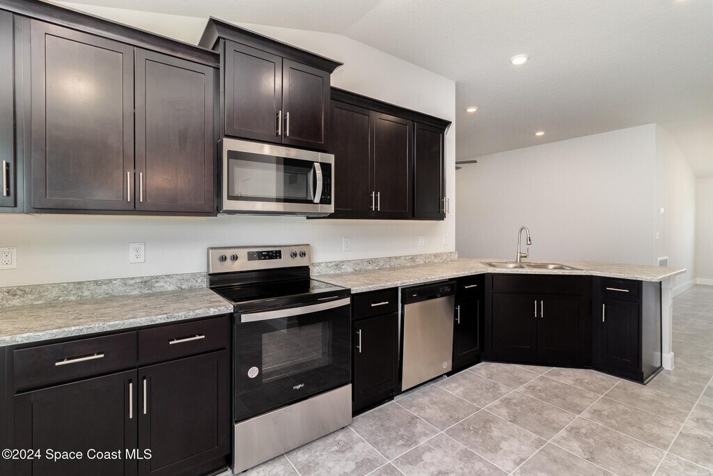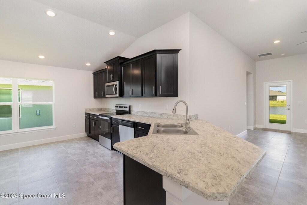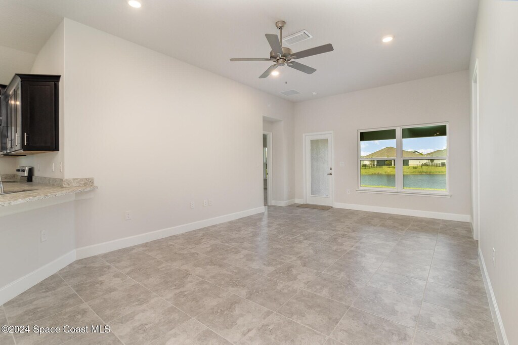 Welcome to this lovely,spacious and open floor plan located inside the Courtyards At Waterstone community in south Palm Bay,Next to Sunrise Elementary School and minutes from Bayside High School! Step into your kitchen featured with a separate nook area,upgraded 36'' ESPRESSO ALL WOOD cabinets and stainless steel appliances. The master's suite features a large walk-in closet,double vanity,brushed nickel fixtures,and a large 5' shower! Other features include double pan (low-E) windows w/ storm shutters,ceiling fans,and so much more! Paver Driveways and stone accents as well !! Enjoy the sunset on your covered lanai with that gorgeous lake view !! HOA managed including pool,cabana and gated entry! Walking Distance to Publix and other convenience stores and various retails.