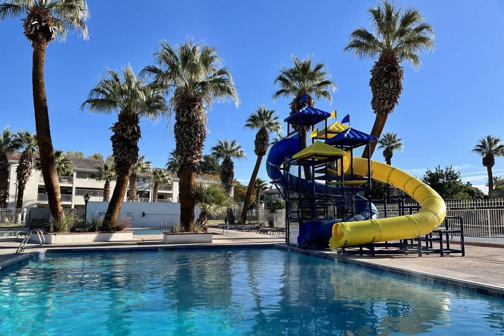 Feel at home in this spacious 3-bedroom, 3-bath condo at Las Palmas Resort, offering 1,700 sq ft of comfort on the top (3rd) floor with stunning views of the red rock mountains. This condo is ideal for families, couples, or friends looking for a fun and relaxing escape. As a guest, you'll enjoy access to five amazing pools, including an indoor heated pool, a waterfall pool, waterslide pool, lap/lounge pool, and a kiddie pool. Relax year-round in any of the four hot tubs, or stay active with access to the fitness room, basketball court, pickleball courts, and three playgrounds. The Las Palmas Resort Clubhouse and Waterpark offers a clubhouse lounge and shop with drink and snack bars, an outdoor lap pool, a giant splash pad with mega toys, giant double waterslides with pool, shuffle board courts and playground, lawn chess, and ping pong. Quiet hours are between 10:00 pm and 6:00 am. Guests are responsible for placing daily trash in the outdoor garbage receptacles and placing outdoor receptacles on the curb Sunday evening for a 6:00 am pick up time Monday morning, if staying over a Sunday. Garbage and recycling receptacles can be found at the front of the home or in the garage. [SI]