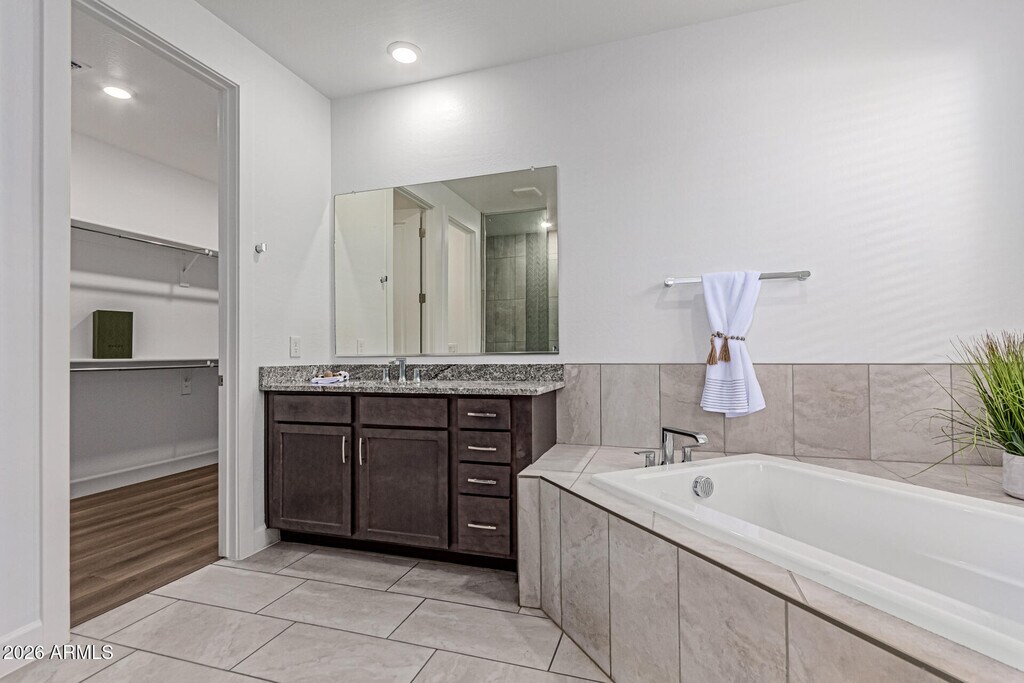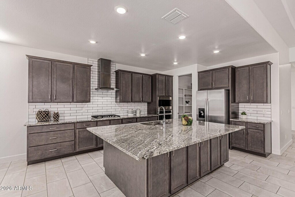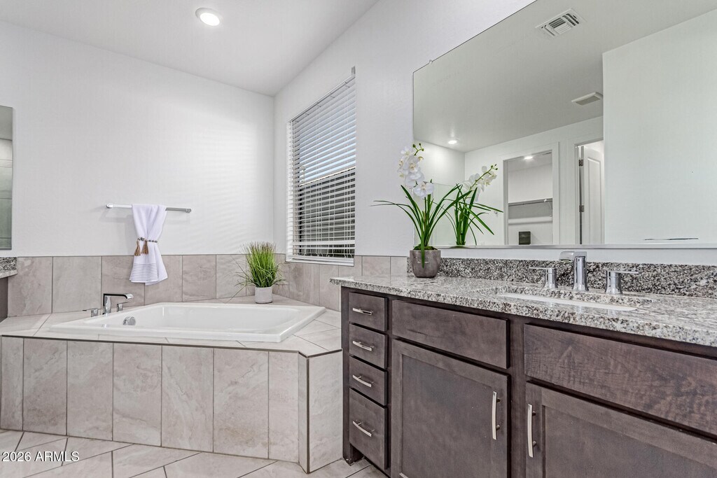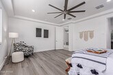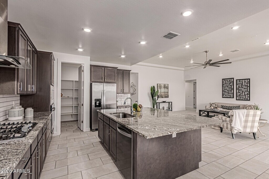 Upgraded & newer 2022 built 5 bed/3 bath single level home w/3 car garage in Estrella! Brand new interior paint and LVP flooring in bedrooms - no carpet. Open great room boasts 11' ceilings. Lg chef's kitchen equipped w/plenty of cabinet space,oversized island,granite counters,huge walk in pantry & S/S appliances including gas cooktop,wall oven and refrigerator. Split floor plan w/lg primary suite showcasing 2 sinks w/large walk in shower,deep soaking tub & walk-in closet. All bathrooms upgraded with granite counters and tiled showers. Flex space off four bedrooms and two more full baths too! Private backyard w/covered patio and artificial turf where you can sit back and enjoy mountain views. Enjoy all the amenities Estrella has to offer!