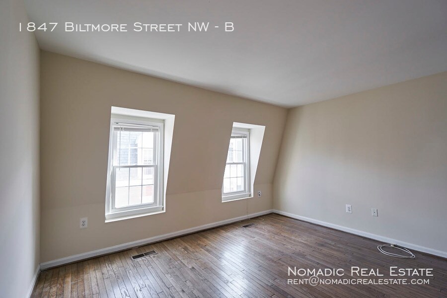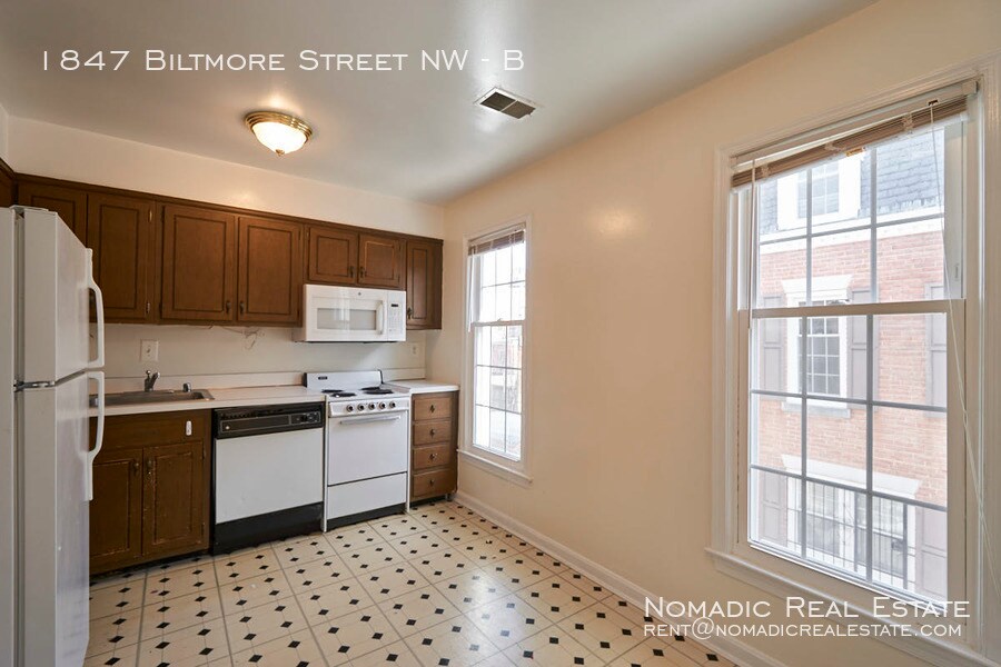 **ONE MONTH FREE RENT! $3613 is the effective rent if you average 1 month free over the course of 12 months (not actual rent). After one month free, rent returns to $3,942.32/month. $1000 cashback at time of move-in*** 2 Bed / 1.5 Bath condo available at 1847 Biltmore St NW #B, Washington, DC 20009 Beautiful Adams Morgan condo featuring hardwood floors, spacious closets, and an open layout. VIRTUAL AND IN-PERSON TOURS AVAILABLE - ONLINE APPLICATION - PLEASE INQUIRE! Be greeted to beautiful hardwood floors in an expansive split level open layout on second and third floors. Bright living room with hardwood floors, fireplace, natural light and easy access to small balcony. Kitchen features excellent countertop and cabinet space, electric range, dishwasher and is convenient to elevated dining room. Spacious den has a bathroom attached to it as well. Travel upstairs and discover large bedroom with terrific duel closet space. Second bedroom is also spacious with two convenient closets. Terrific Adams Morgan location, tucked off of Calvert and Columbia and a block away from the 18th Street NW Corridor where you will discover wonderful options including world-wide restaurants and flavor, lounges, sports bars, cafes, and more! Very close to Walter Pierce Park and Rock Creek Park Trails, this neighborhood provides the best of urban life and tranquility of nature. Woodley Park Zoo Metro Station is only a half a mile walk and will get you everywhere you need to go. Kalorama Mews is a gorgeous serene brick appointed community 12-month lease preferred. Water and trash included. Pets are case by case. Washer and dryer in-unit. Vouchers are accepted. Apply online in 10 minutes! Please reach out with any questions and we'll be happy to speak with you! Allow Cats Allow Large Dogs Allow Small Dogs Heating In Unit Laundry Laundry On Site Pets Allowed Rent Includes Sewer Rent Includes Water Single Story Only Washer Dryer In Unit Washer/Dryer In Unit