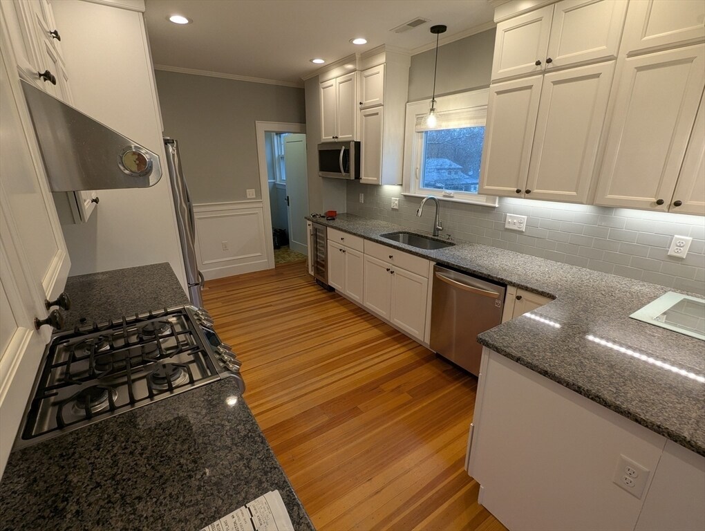 Spacious and renovated 4BR/2BA near Arlington Center with in-unit laundry,garage parking,and outdoor space. This bright and sunny home features abundant charm and is located in a sought-after part of town within Bishop Elementary School. Prepare a warm meal in the modern kitchen featuring stainless appliances,granite counters and white shaker cabinets,and eat peacefully in the adjoining dining room. A large living room offers a nice fireplace,with an attached home office/bonus room to the side. The huge master bedroom features cathedral ceilings and generous closets and little nooks for plenty of storage. In addition to 4 bedrooms,there is a separate play room,an additional nursery space,and the aforementioned home office/bonus room. The convenient location offers great access to public transportation and is a short distance to numerous restaurants and shops. The shared backyard is a nice and quiet outdoor space with a patio and pergola,plus Mystic Lakes State Park is nearby. MLS# 73460330
