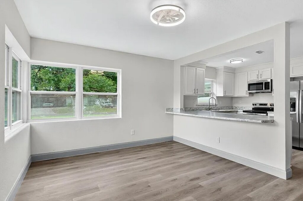 Completely Renovated 3BR/1.5BA Home - Move-In Ready! This beautifully updated home features an open floor plan with abundant natural light throughout. Freshly painted inside and out, offering new luxury vinyl plank wood-look flooring, new carpet in the bedrooms, and updated ceiling fans, including modern bladeless fans with lights in the family room. The bathrooms have been fully refreshed with new vanities, toilets, and fixtures. Enjoy a brand-new kitchen with stainless steel appliances, new cabinetry, and stylish finishes. Situated on a large corner lot with a concrete patio table, perfect for outdoor entertaining or relaxing.