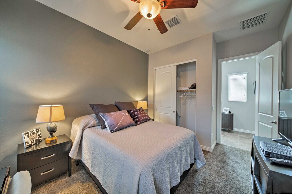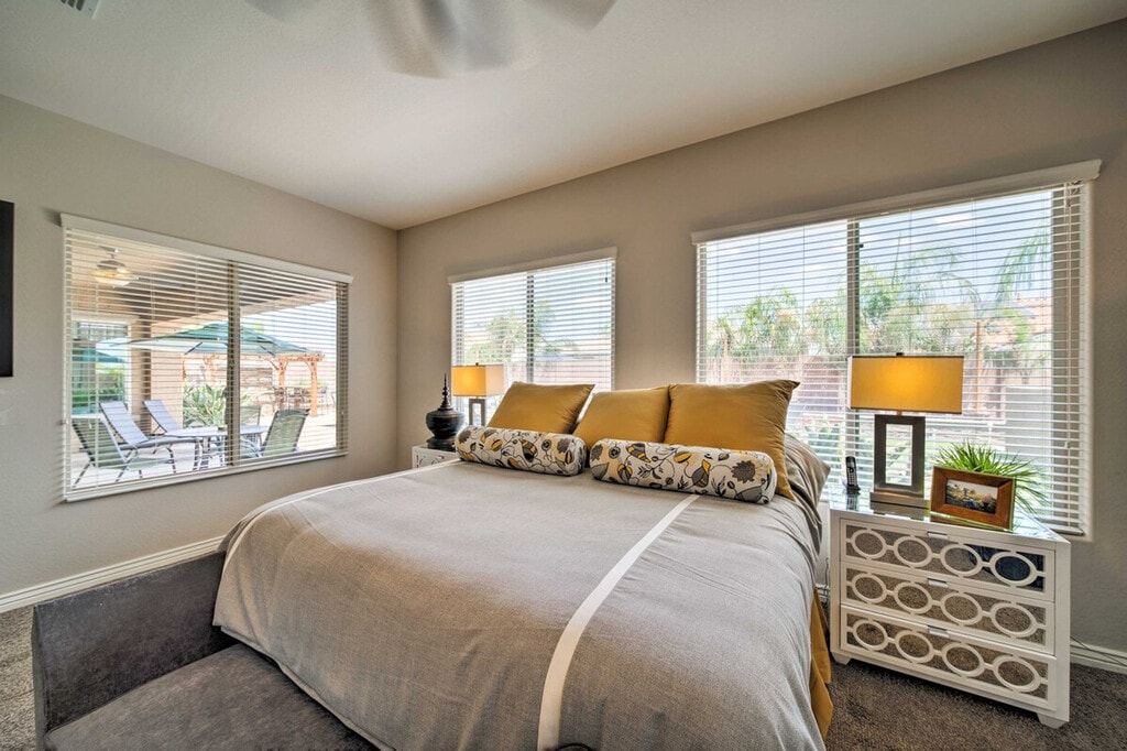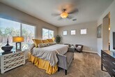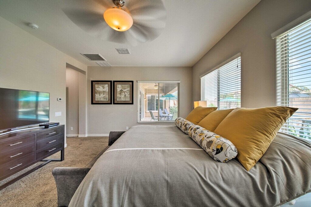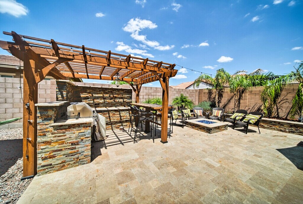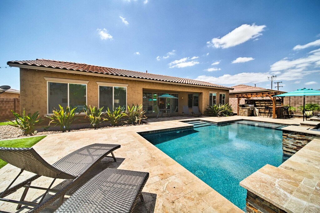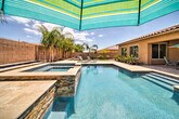 The advertised rate of $7,943/month is the lowest available price, based on a 30 day(s) stay with a move-in date of May 23, 2026. Rates vary depending on the duration of stay, season, and other parameters. For exact pricing and additional pricing components, please visit our website and enter your desired move-in and move-out dates. The rate is applicable when billed upfront; it can be higher if billed in multiple payments. Experience a luxurious Arizona retreat and feel at home in this 4-bedroom, 2.5-bathroom vacation rental in Surprise. This spacious 2,700-square-foot home offers a comfortable and memorable stay. This home boasts a modern interior with 5 Smart TVs (streaming only; no cable/satellite) and 2 sofas. The fully equipped kitchen includes a dishwasher, refrigerator, stovetop, 2 ovens, microwave, coffee maker, dining table, breakfast bar, and granite countertops. Enjoy outdoor living with a kitchen, fridge, gas grill, linear fireplace, gas fire pit, private pool with baja deck, hot tub, putting green, and covered patio. Other amenities include free Wi-Fi, ceiling fans, central air conditioning, central heating, linens, towels, complimentary toiletries, a hair dryer, an iron/board, trash bags, and paper towels. There is an optional pool heat fee of $100/night (plus fees and taxes, paid pre-trip, applied to entire stay). Hit the town by hitting the links at one of the local golf courses before going on a shopping spree! Return to dine al fresco on the patio with a kitchen. Quiet hours are from 11:00 PM to 8:00 AM. No smoking, pets, events, parties, or large gatherings are allowed. This property features 5 exterior security cameras. Camera 1 is located at the front door facing the front entrance, camera 2 is in front of the garage facing the driveway, camera 3 is located on the single-car garage, and cameras 4 & 5 are each on the side of the house facing the gates. The cameras are outward facing and do not look into interior spaces. All cameras record video and sound when activated by motion. [SI]