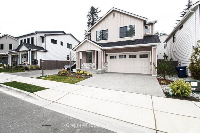 Brand New Spacious 5-Bedroom Retreat at Coyote Ridge 3 Full Baths 2 Car Garage 2330sf A/C Prime Bothell Location! Amazon shuttle within is walking distance from property! * Homes features the latest in contemporary finishes, Luxury plank flooring throughout the main floor. 9 foot ceilings * Stunning chef's kitchen with stainless steel appliances, Gas range, quartz counters, huge french door pantry and center island with overhang for bar stools. * Open concept great room * Main floor has 5th bedroom, great home office or hobby room and is next to a full bath making it a nice guest bedroom option. * Upstairs Primary bedroom is big enough for all the king-sized furniture. * Ensuite bath with double sinks, quartz counters, soaking tub and separate shower. Large walk in closet. * Upstairs Bonus/Loft room will make a perfect home theater or game room. * Upstairs laundry with washer and dryer included. * Vibrant and quaint downtown Mill Creek is about 1.5 miles away with restaurants, shops. * Extra storage throughout. * Patio out back with full fenced yard * A/C Amazon shuttle is available at North Lake Christian Church which is walking distance from property! *Conveniently located minutes from 405, I-5, shopping, parks & more! Sorry, No Pets. Presented by Gregory Property Management. Call with questions 9 am to 5 pm Monday through Friday This property allows self guided viewing without an appointment. Contact for details.