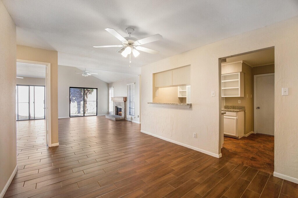 Three large bedrooms,2 baths and attached garage with opener. Ceramic tile flooring- no carpet! Kitchen updated with granite countertops and has large breakfast/dining area. High ceilings in den with fireplace and plenty of natural light. Primary bedroom offers a large walk-in closet and En-suite bath. Landscaped yard is completely fenced in with black,wrought iron gate for entrance. Interior lighting has been updated. Area pool with green space. Schedule your appointment today! MLS# 92667078