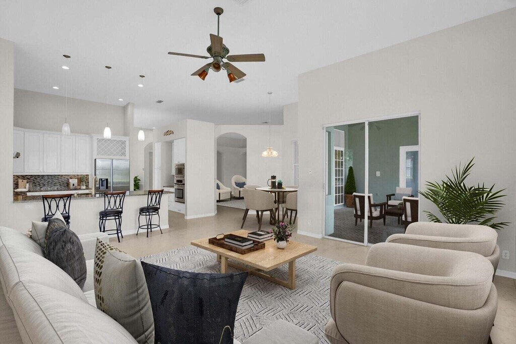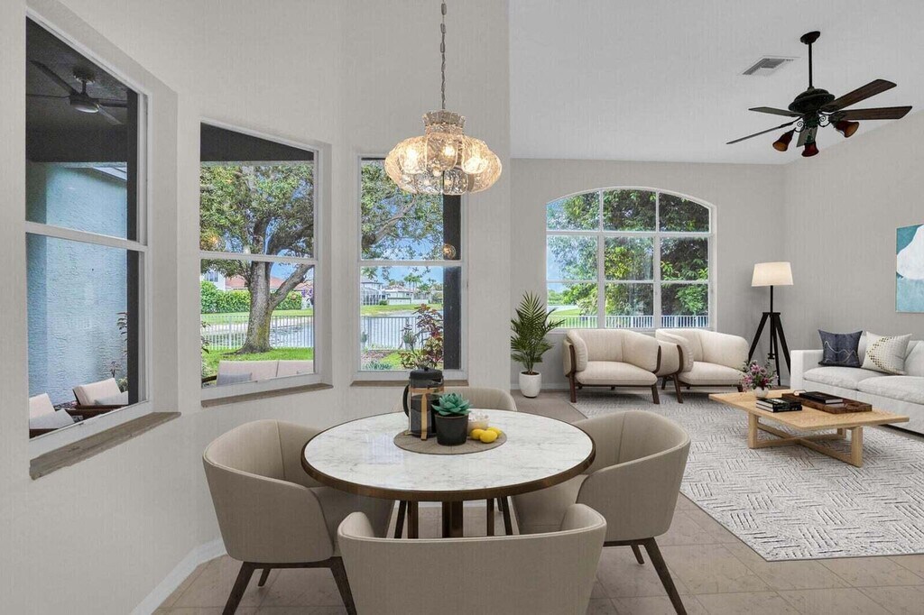 Step into this rare 4-bedroom, 2.5-bathroom home located in the sought after gated community of The Shores at Boca Raton. Now available for unfurnished annual rental, this home is situated on one of the best waterfront lots in the community with long lake views, offering a rare sense of privacy. Brand new roof installed in 2025! Curb appeal sets the tone with fresh landscaping and a freshly painted exterior inviting you inside to a thoughtfully designed floor plan filled with natural light. Throughout the home, beautiful laminate and tile flooring create a warm, low-maintenance atmosphere. The oversized living room offers 12 foot ceilings and plenty of seating room perfect for soaking in the stunning lake view.