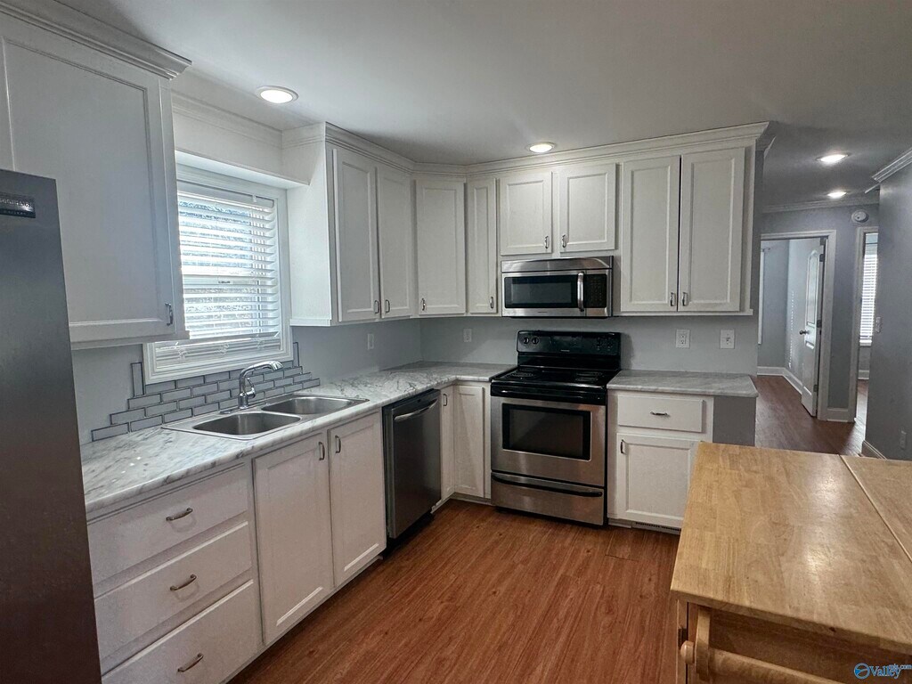 Beautifully updated 3 bedroom,2 bath home featuring smooth ceilings and stunning LVP flooring throughout. Enjoy an open concept layout with a spacious,isolated primary suite and a massive walk in closet. The modern kitchen boasts marble countertops and a convenient island overlooking the living and dining areas,perfect for entertaining family and friends. Bathrooms are bright and elegant,finished with luxury vinyl tile. Additional highlights include a barn style laundry room door and a large,level backyard ideal for outdoor enjoyment.