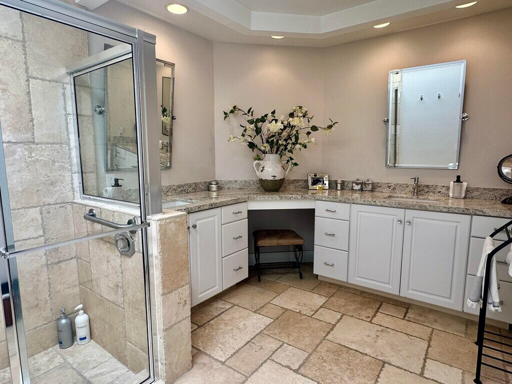 Experience the elegance of this beautifully remodeled 300 Max Plan,featuring 2 bedrooms PLUS den that owner has added a bed to,and 2 baths. With fine custom finishes from top to bottom,this spacious condo exudes sophistication. The tumbled Travertine flooring flows seamlessly throughout,enhancing the home's luxurious feel. The stunning kitchen boasts a generous counter bar,perfect for entertaining. Tastefully appointed furnishings complement the stylish design,while the elevated location offers breathtaking views of the golf course. Don't miss your chance to call this exceptional property homeplease call for availability!